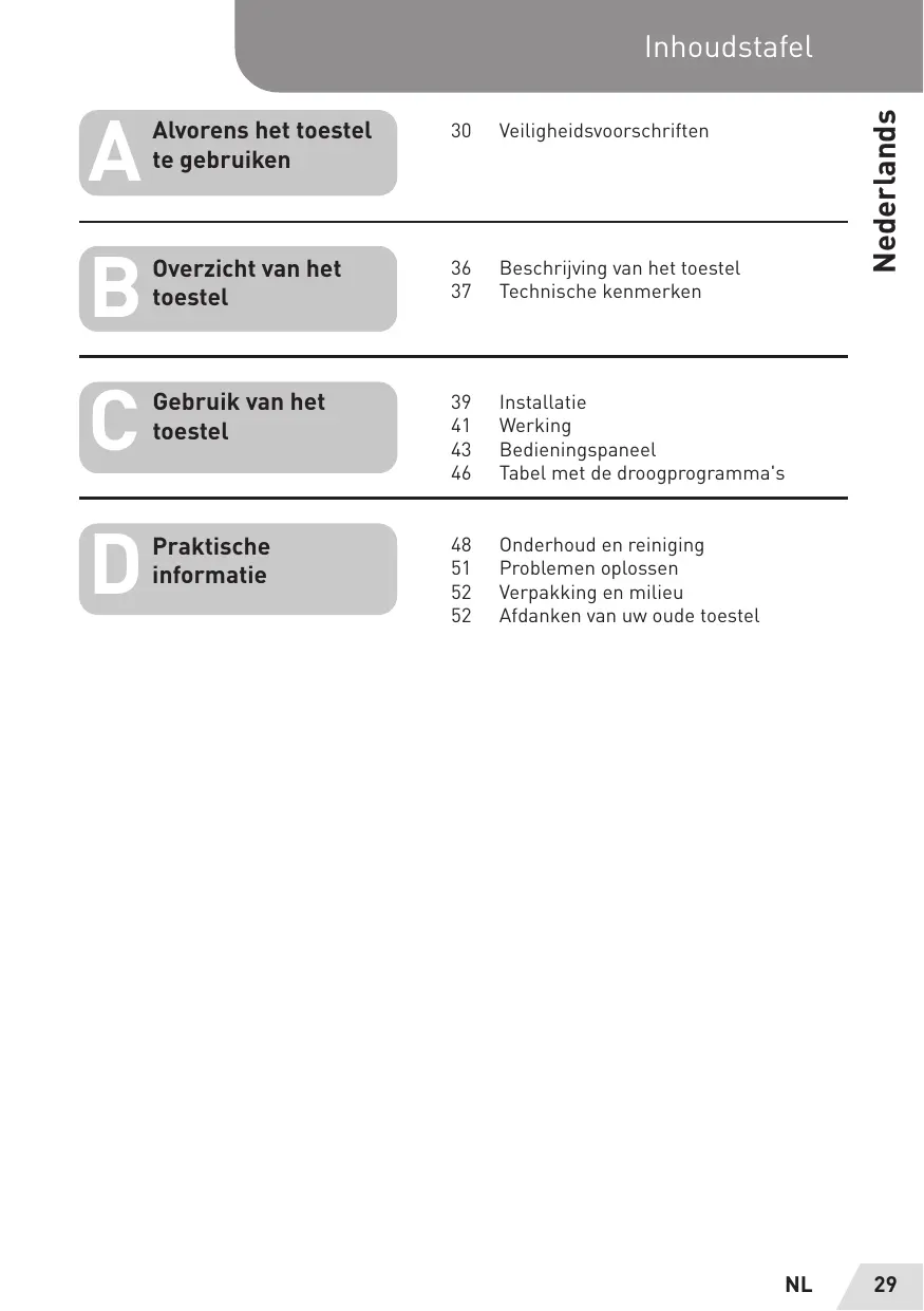 Inhoudstafel Alvorens het toestel 30 Veiligheidsvoorschriften te gebruiken Overzicht van het 36 Beschrijving van het toestel toestel 37 Technische kenmerken Gebruik van het 39 Installatie toestel 41 Werking 43 Bedieningspaneel 46 Tabel met de droogprogramma's Praktische 48 Onderhoud en reiniging informatie 51 Problemen oplossen 52 Verpakking en milieu 52 Afdanken van uw oude toestel