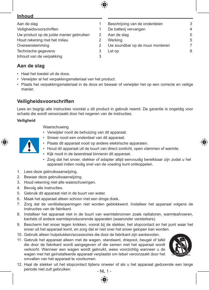+ Veillez à ce que l'appareil ne soit pas exposé à la lumière directe du soleil, à une flamme nue ni à une source de chaleur. + Ne regardez jamais directement le faisceau laser à l'intérieur de cet appareil. + Veillez à toujours pouvoir accéder facilement au câble d'alimentation, à la fiche ou à l'adaptateur pour débrancher l'appareil de l'alimentation. 1. Lisez ces instructions 2. Conservez ces instructions. 3. Prenez en compte tous les avertissements. 4. Respectez toutes les instructions. 5. N'utilisez pas cet appareil à proximité d'un point d'eau 6._ Nettoyez l'appareil exclusivement avec un chiffon sec. 7. N'obstruez aucun des orifices de ventilation du produit. Installez l'appareil en respectant les