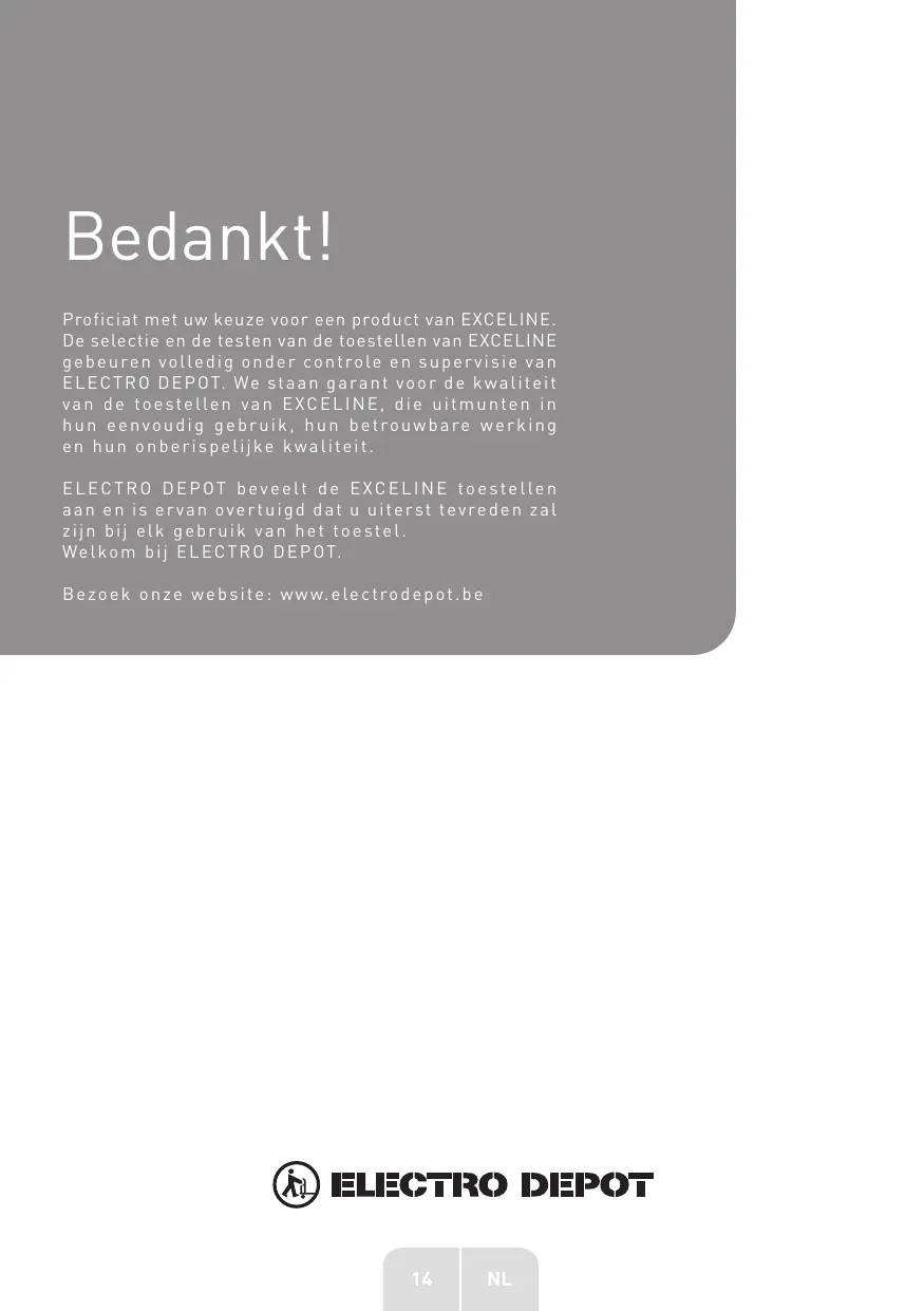Bedankt! Proficiat met uw k voor een product van EXCELINE De selectie en de testen van de toestellen van EXCELINE gebeuren volledig onder controle en supe ELECTRO DEPOT. We staan garant voor de kw van de toestellen van EXCELINE, die uitmunten in hun eenvoudig gebruik, hun betrouwbare werking en hun onberispelijke kwaliteit ELECTRO DEPOT beveelt de EXCELINE toestellen aan en is ervan overtuigd dat u uiterst t zijn bij elk gebruik van het toestel Welkom bij ELECTRO DEPOT. Bezoek onze website: www.el TRO DEPOT