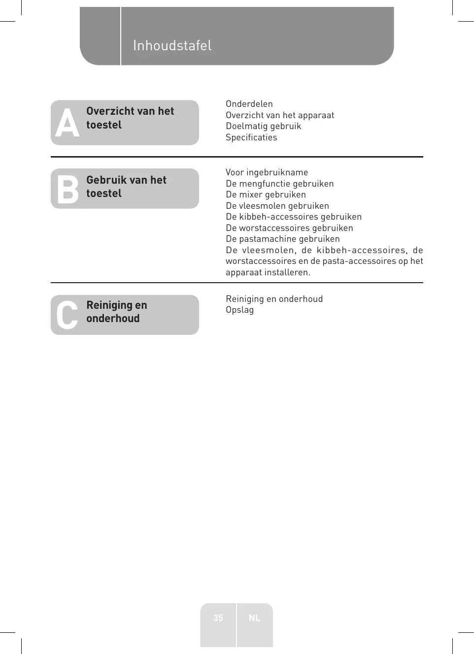 Inhoudstafel a Onderdelen Overzicht van het Overzicht van het apparaat toestel Doelmatig gebruik Specificaties h Voor ingebruikname Gebruik van het De mengfunctie gebruiken toestel De mixer gebruiken De vleesmolen gebruiken De kibbeh-accessoires gebruiken De worstaccessoires gebruiken De pastamachine gebruiken De vleesmolen, de kibbeh-accessoires, de worstaccessoires en de pasta-accessoires op het apparaat installeren. Reinigi Reiniging en onderhoud einiging en Opslag onderhoud