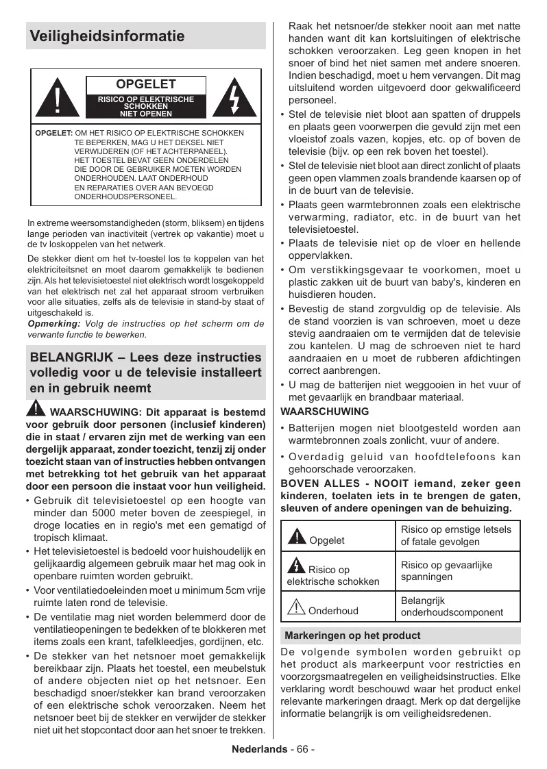 À waarscHuwiNG: Dit apparaat is bestemd voor gebruik door personen (inclusief kinderen) die in Staat / ervaren zijn met de werking van een dergelijk apparaat, zonder toezicht, tenzij zij onder toezicht staan van of instructies hebben ontvangen met betrekking tot het gebruik van het apparaat door een persoon die instaat voor hun veiligheid. + Gebruik dit televisietoestel op een hoogte van minder dan 5000 meter boven de zeespiegel, in droge locaties en in regio's met een gematigd of tropisch klimaat