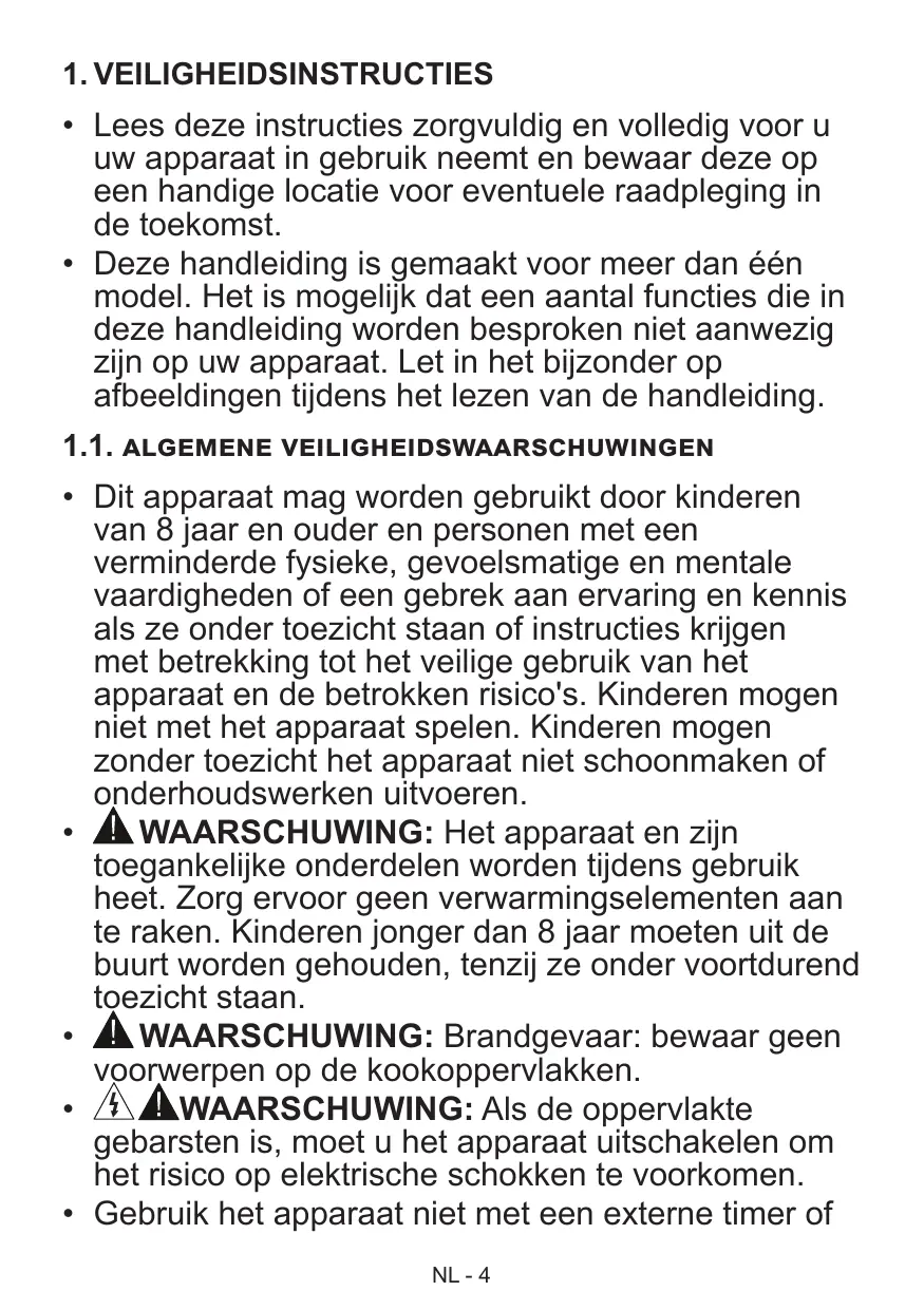 .1. ALGEMENE VEILIGHEIDSWAARSCHUWINGEN Dit apparaat mag worden gebruikt door kinderen van 8 jaar en ouder en personen met een verminderde fysieke, gevoelsmatige en mentale vaardigheden of een gebrek aan ervaring en kennis als ze onder toezicht staan of instructies krijgen met betrekking tot het veilige gebruik van het apparaat en de betrokken risico's. Kinderen mogen niet met het apparaat spelen. Kinderen mogen zonder toezicht het apparaat niet schoonmaken of onderhoudswerken uitvoeren. À WAARSCHUWING: Het apparaat en zijn toegankelijke onderdelen worden tijdens gebruik heet. Zorg ervoor geen verwarmingselementen aan te raken. Kinderen jonger dan 8 jaar moeten uit de buurt worden gehouden, tenzij ze onder voortdurend toezicht staan. À WAARSCHUWING: Brandgevaar: bewaar geen voorwerpen op de kookoppervlakken. WAARSCHUWING: Als de oppervlakte gebarsten is, moet u het apparaat uitschakelen om het risico op elektrische schokken te voorkomen.