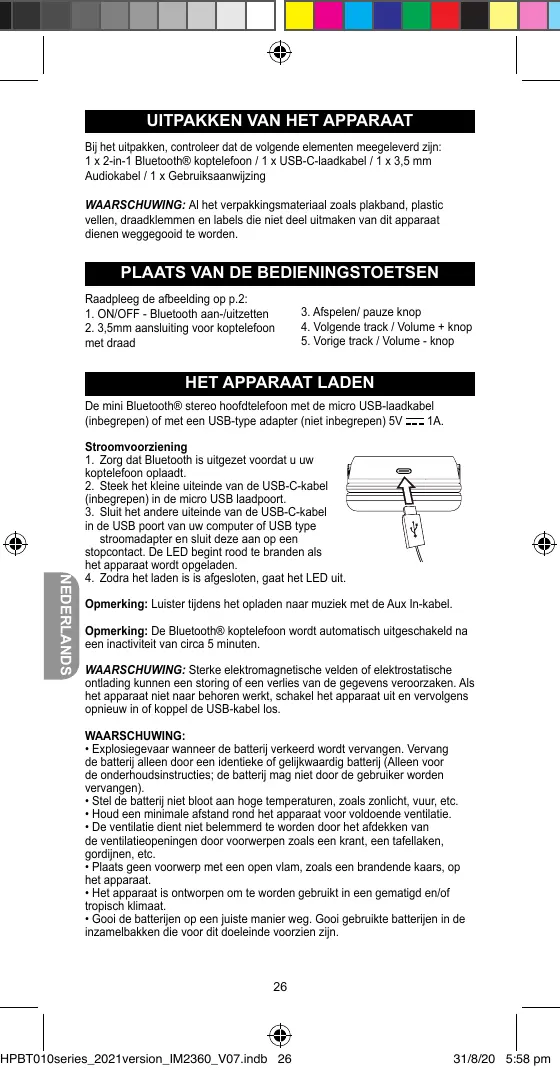 Lors du déballage, assurez-vous que les pièces suivantes soient incluses 1x Casque Bluetooth® 2 en 1 / 1 x Câble de charge USB type-C /