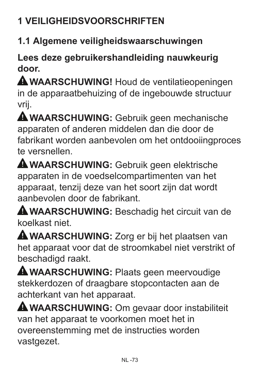 Lees deze gebruikershandleiding nauwkeurig door. À WAARSCHUWING! Houd de ventilatieopeningen in de apparaatbehuizing of de ingebouwde structuur vrij. À WAARSCHUWING: Gebruik geen mechanische apparaten of anderen middelen dan die door de fabrikant worden aanbevolen om het ontdooiïingproces te versnellen. À WAARSCHUWING: Gebruik geen elektrische apparaten in de voedselcompartimenten van het apparaat, tenzij deze van het soort zijn dat wordt aanbevolen door de fabrikant. À WAARSCHUWING: Beschadig het circuit van de koelkast niet. À WAARSCHUWING: Zorg er bij het plaatsen van het apparaat voor dat de stroomkabel niet verstrikt of beschadigd raakt. À WAARSCHUWING: Plaats geen meervoudige stekkerdozen of draagbare stopcontacten aan de achterkant van het apparaat. À WAARSCHUWING: Om gevaar door instabiliteit van het apparaat te voorkomen moet het in overeenstemming met de instructies worden vastgezet. NL-73