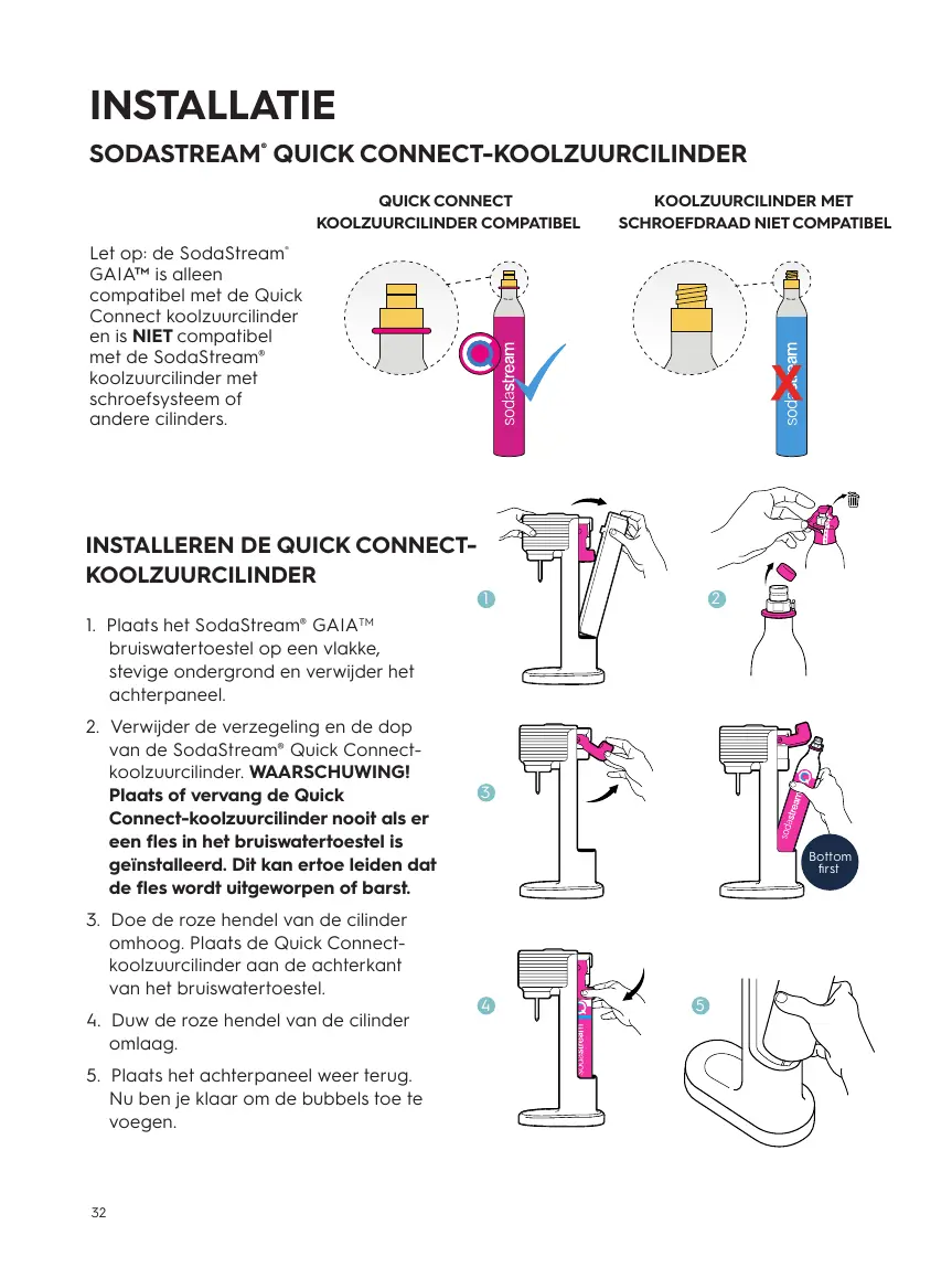 Let op: de SodaStream GAIAM“ is alleen compatibel met de Quick Connect koolzuurcilinder en is NIET compatibel met de SodaStream” koolzuurcilinder met schroefsysteem of andere cilinders