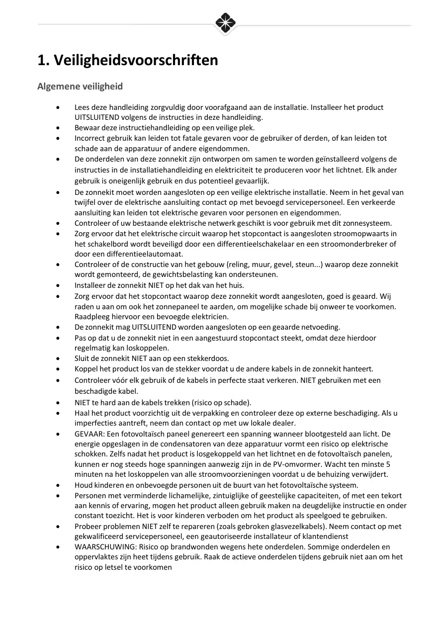 Algemene veiligheid + Lees deze handieiding zorgvuldig door voorafgaand aan de installatie. Installeer het product UITSLUITEND volgens de instructies in deze handieiding. + Bewaar deze instructiehandleiding op een veilige plek. + incorrect gebruik kan leiden tot fatale gevaren voor de gebruiker of derden, of kan leiden tot schade aan de apparatuur of andere eigendommen. + De onderdelen van deze zonnekit zijn ontworpen om samen te worden geïnstalleerd volgens de instructies in de installatiehandleiding en elektriciteit te produceren voor het lichtnet. Elk ander gebruik is oneigenlik gebruik en dus potentiel gevaarlik. + De zonnekit moet worden aangesloten op een veilige elektrische installatie. Neem in het geval van twifel over de elektrische aansluiting contact op met bevoegd servicepersoneel. Een verkeerde aansluiting kan leiden tot elektrische gevaren voor personen en eigendommen. + Controleer of uw bestaande elektrische netwerk geschikt is voor gebruik met dit zonnesysteem. + org ervoor dat het elektrische circuit waarop het stopcontact is aangesloten stroomopwaarts in het schakelbord wordt beveiligd door een differentieelschakelaar en een stroomonderbreker of door een differentieelautomaat. + Controleer of de constructie van het gebouw (reling, muur, gevel, steun...) waarop deze zonnekit wordt gemonteerd, de gewichtsbelasting kan ondersteunen. + Installeer de zonnekit NIET op het dak van het huis. + org ervoor dat het stopcontact waarop deze zonnekit wordt aangesloten, goed is geaard. Wij raden u aan om ook het zonnepaneel te aarden, om mogelijke schade bij onweer te voorkomen. Raadpleeg hiervoor een bevoegde elektricien. + Dezonnekit mag UITSLUITEND worden aangesloten op een geaarde netvoeding. + Pas op dat u de zonnekit niet in een aangestuurd stopcontact steekt, omdat deze hierdoor regelmatig kan loskoppelen. + Sluit de zonnekit NIET aan op een stekkerdoos. + Koppel het product los van de stekker voordat u de andere kabels in de zonnekit hanteert. + Controleer véér elk gebruik of de kabels in perfecte staat verkeren. NIET gebruiken met een beschadigde kabel. + NIET te hard aan de kabels trekken (risico op schade). + Haal het product voorzichtig uit de verpakking en controleer deze op externe beschadiging. AIs u imperfecties aantreft, neem dan contact op met uw lokale dealer. + GEVAAR: Een fotovoltaïsch paneel genereert een spanning wanneer blootgesteld aan licht. De energie opgeslagen in de condensatoren van deze apparatuur vormt een risico op elektrische schokken. Zelfs nadat het product is losgekoppeld van het lichtnet en de fotovoltaisch panelen, kunnen er nog steeds hoge spanningen aanwezig zijn in de PV-omvormer. Wacht ten minste 5 minuten na het loskoppelen van alle stroomvoorzieningen voordat u de behuizing verwijdert. + Houdkinderen en onbevoegde personen uit de buurt van het fotovoltaïsche systeem. + Personen met verminderde lichamelijke, zintuiglike of geestelifke capaciteiten, of met een tekort aan kennis of ervaring, mogen het product alleen gebruik maken na deugdelike instructie en onder constant toezicht. Het is voor kinderen verboden om het product als speelgoed te gebruiken. + Probeer problemen NIET zelf te repareren (zoals gebroken glasvezelkabels). Neem contact op met gekwalificeerd servicepersoneel, een geautoriseerde installateur of klantendienst + WAARSCHUWING: Risico op brandwonden wegens hete onderdelen. Sommige onderdelen en opperviaktes zijn heet tijdens gebruik. Raak de actieve onderdelen tijdens gebruik niet aan om het risico op letsel te voorkomen