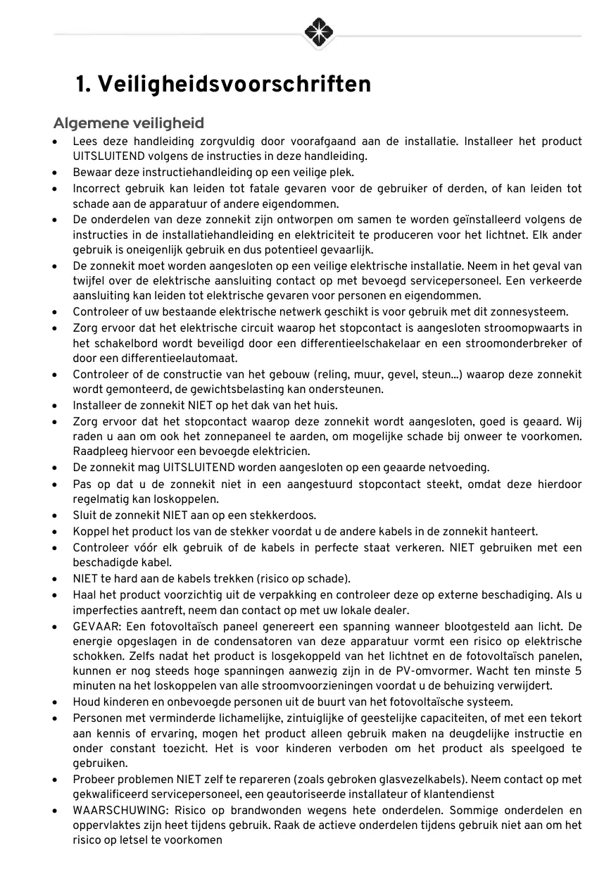 Algemene veiligheid + Lees deze handleïding zorgvuldig door voorafgaand aan de installatie. Installeer het product UITSLUITEND volgens de instructies in deze handieiding. + Bewaar deze instructiehandieiding op een veilige plek. + incorrect gebruik kan leiden tot fatale gevaren voor de gebruiker of derden, of kan leiden tot schade aan de apparatuur of andere eigendommen. + De onderdelen van deze zonnekit zijn ontworpen om samen te worden geinstalleerd volgens de instructies in de installatiehandleiding en elektriciteit te produceren voor het lichtnet. Elk ander gebruik is oneigenlik gebruik en dus potentieel gevaarlijk. + De zonnekit moet worden aangesloten op een veilige elektrische installatie. Neem in het geval van twijfel over de elektrische aansluiting contact op met bevoegd servicepersoneel. Een verkeerde aansluiting kan leiden tot elektrische gevaren voor personen en eigendommen. + Controleer of uw bestaande elektrische netwerk geschikt is voor gebruik met dit zonnesysteem. + Zorg ervoor dat het elektrische circuit waarop het stopcontact is aangesloten stroomopwaarts in het schakelbord wordt beveiligd door een differentieelschakelaar en een stroomonderbreker of door een differentieelautomaat. + Controleer of de constructie van het gebouw (reling, muur, gevel, steun..) waarop deze zonnekit wordt gemonteerd, de gewichtsbelasting kan ondersteunen. + Installer de zonnekit NIET op het dak van het huis. + Zorg ervoor dat het stopcontact waarop deze zonnekit wordt aangesloten, goed is geaard. Wij raden u aan om ook het zonnepaneel te aarden, om mogelijke schade bij onweer te voorkomen. Raadpleeg hiervoor een bevoegde elektricien. + De zonnekit mag UITSLUITEND worden aangesloten op een geaarde netvoeding. + Pas op dat u de zonnekit niet in een aangestuurd stopcontact steekt, omdat deze hierdoor regelmatig kan loskoppelen. + Sluit de zonnekit NIET aan op een stekkerdoos. + Koppel het product los van de stekker voordat u de andere kabels in de zonnekit hanteert. + Controleer véér elk gebruik of de kabels in perfecte staat verkeren. NIET gebruiken met een beschadigde kabel. + NIET te hard aan de kabels trekken (risico op schade). + Haal het product voorzichtig uit de verpakking en controleer deze op externe beschadiging. AIS u imperfecties aantreft, neem dan contact op met uw lokale dealer. + GEVAAR: Een fotovoltaïsch paneel genereert een spanning wanneer blootgesteld aan licht. De energie opgeslagen in de condensatoren van deze apparatuur vormt een risico op elektrische schokken. Zelfs nadat het product is losgekoppeld van het lichtnet en de fotovoltaïsch panelen, kunnen er nog steeds hoge spanningen aanwezig zijn in de PV-omvormer. Wacht ten minste 5 minuten na het loskoppelen van alle stroomvoorzieningen voordat u de behuizing verwijdert. + Houd kinderen en onbevoegde personen uit de buurt van het fotovoltaïsche systeem. + Personen met verminderde lichamelijke, zintuiglijke of geestelijke capaciteiten, of met een tekort aan kennis of ervaring, mogen het product alleen gebruik maken na deugdelijke instructie en onder constant toezicht. Het is voor kinderen verboden om het product als speelgoed te gebruiken. + Probeer problemen NIET zelf te repareren (zoals gebroken glasvezelkabels). Neem contact op met gekwalificeerd servicepersoneel, een geautoriseerde installateur of klantendienst + WAARSCHUWING: Risico op brandwonden wegens hete onderdelen. Sommige onderdelen en opperviaktes zijn heet tidens gebruik. Raak de actieve onderdelen tijdens gebruik niet aan om het risico op letsel te voorkomen