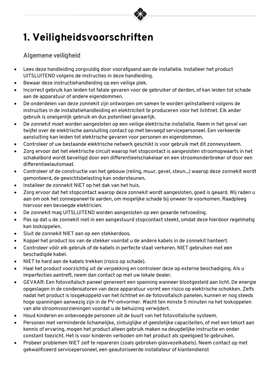 Algemene veiligheid Lees deze handleiding zorgvuldig door voorafgaand aan de installatie. Installer het product UITSLUITEND volgens de instructies in deze handieiding. Bewaar deze instructiehandieiding op een veilige plek. incorrect gebruik kan leiden tot fatale gevaren voor de gebruiker of derden, of kan leiden tot schade aan de apparatuur of andere eigendommen. De onderdelen van deze zonnekit zin ontworpen om samen te worden geïnstalleerd volgens de instructies in de installatiehandleiding en elektriciteit te produceren voor het lichtnet. Elk ander gebruik is oneigenlijk gebruik en dus potentieel gevaarlik. De zonnekit moet worden aangesloten op een veilige elektrische installatie. Neem in het geval van twijfel over de elektrische aansluiting contact op met bevoegd servicepersoneel. Een verkeerde aansluiting kan leiden tot elektrische gevaren voor personen en eigendommen. Controleer of uw bestaande elektrische netwerk geschikt is voor gebruik met dit zonnesysteem. Zorg ervoor dat het elektrische circuit waarop het stopcontact is aangesloten stroomopwaarts in het schakelbord wordt beveiligd door een differentieelschakelaar en een stroomonderbreker of door een differentieelautomaat. Controleer of de constructie van het gebouw (reling, muur, gevel, steun..) waarop deze zonnekit wordt gemonteerd, de gewichtsbelasting kan ondersteunen. Installeer de zonnekit NIET op het dak van het huis. Zorg ervoor dat het stopcontact waarop deze zonnekit wordt aangesloten, goed is geaard. Wij raden u aan om o0k het zonnepaneel te aarden, om mogelike schade bij onweer te voorkomen. Raadpleeg hiervoor een bevoegde elektricien. De zonnekit mag UITSLUITEND worden aangesloten op een geaarde netvoeding. Pas op dat u de zonnekit niet in een aangestuurd stopcontact steekt, omdat deze hierdoor regelmatig kan loskoppelen. Suit de zonnekit NIET aan op een stekkerdoos. Koppel het product los van de stekker voordat u de andere kabels in de zonnekit hanteert. Controleer vér elk gebruik of de kabels in perfecte staat verkeren. NIET gebruiken met een beschadigde kabel. NIET te hard aan de kabels trekken (risico op schade). Haal het product voorzichtig uit de verpakking en controleer deze op externe beschadiging. AIs u imperfecties aantreft, neem dan contact op met uw lokale dealer. GEVAAR: Een fotovoltaisch panel genereert een spanning wanneer blootgesteld aan licht. De energie opgeslagen in de condensatoren van deze apparatuur vormt een risico op elektrische schokken. Zelfs nädat het product is losgekoppeld van het lichtnet en de fotovoltaïsch panelen, kunnen er nog steeds hoge spanningen aanwezig zijn in de PV-omvormer. Wacht ten minste 5 minuten na het loskoppelen van alle stroomvoorzieningen voordat u de behuizing verwijdert. Houd kinderen en onbevoegde personen uit de buurt van het fotovoltaïsche systeem. Personen met verminderde lichamelijke, zintuiglijke of geestelike capaciteiten, of met een tekort aan kennis of ervaring, mogen het product alleen gebruik maken na deugdelijke instructie en onder constant toezicht. Het is voor kinderen verboden om het product als speelgoed te gebruiken. Probeer problemen NIET zelf te repareren (zoals gebroken glasvezelkabels). Neem contact op met gekwalificeerd servicepersoneel, een geautoriseerde installateur of klantendienst
