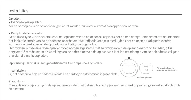 La centre du chargeur sans fl doi être aligné avec le centre du boîtier de charge pour charge, ce qui se trouve environ 5 mm en dessous du logo Xiarmi à l'arrière du boîtier de charge. Le voyant du boitier de charge sera allumé pendant a charge.