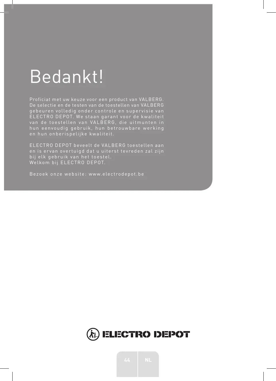Bedankt! Proficiat met uw keuze voor een product van VALBERG. De selectie en de testen van de toestellen van VALBERG gebeuren volledig onder controle en supervisie van ELECTRO DEPOT. We staan garant voor de kwaliteit van de toestellen van VALBERG, die uitmunten in hun eenvoudig gebruik, hun betrouwbare werking en hun onberispelijke kwaliteit. ELECTRO DEPOT beveelt de VALBERG toestellen aan en is ervan overtuigd dat u uiterst tevreden zal zijn bij elk gebruik van het toestel. Welkom bij ELECTRO DEPOT Bezoek onze website: www.electrodepot.be TRO DEPOT