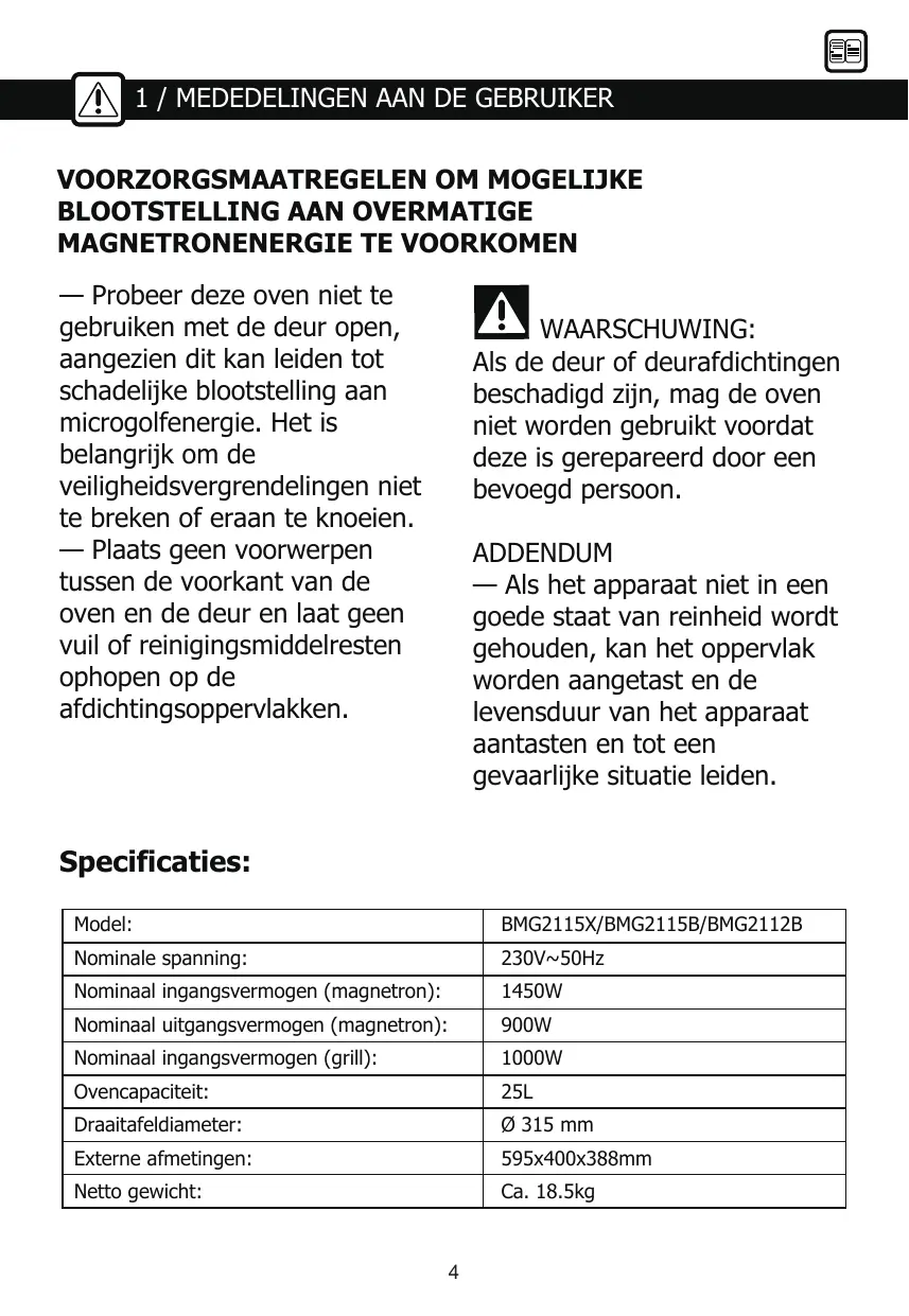 GEBRUIKSAANWIJZING BMG2115B BRANDT