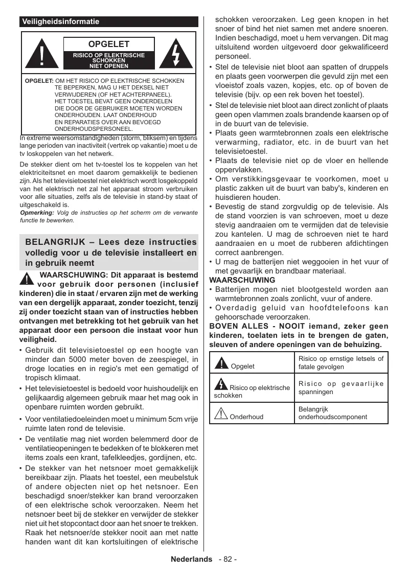BELANGRIJK - Lees deze instructies volledig voor u de televisie installeert en in gebruik neemt WAARSCHUWING: Dit apparaat is bestemd voor gebruik door personen (inclusief kinderen) die in staat / ervaren zijn met de werking van een dergelijk apparaat, zonder toezicht, tenzij zij onder toezicht staan van of instructies hebben ontvangen met betrekking tot het gebruik van het apparaat door een persoon die instaat voor hun veiligheid.