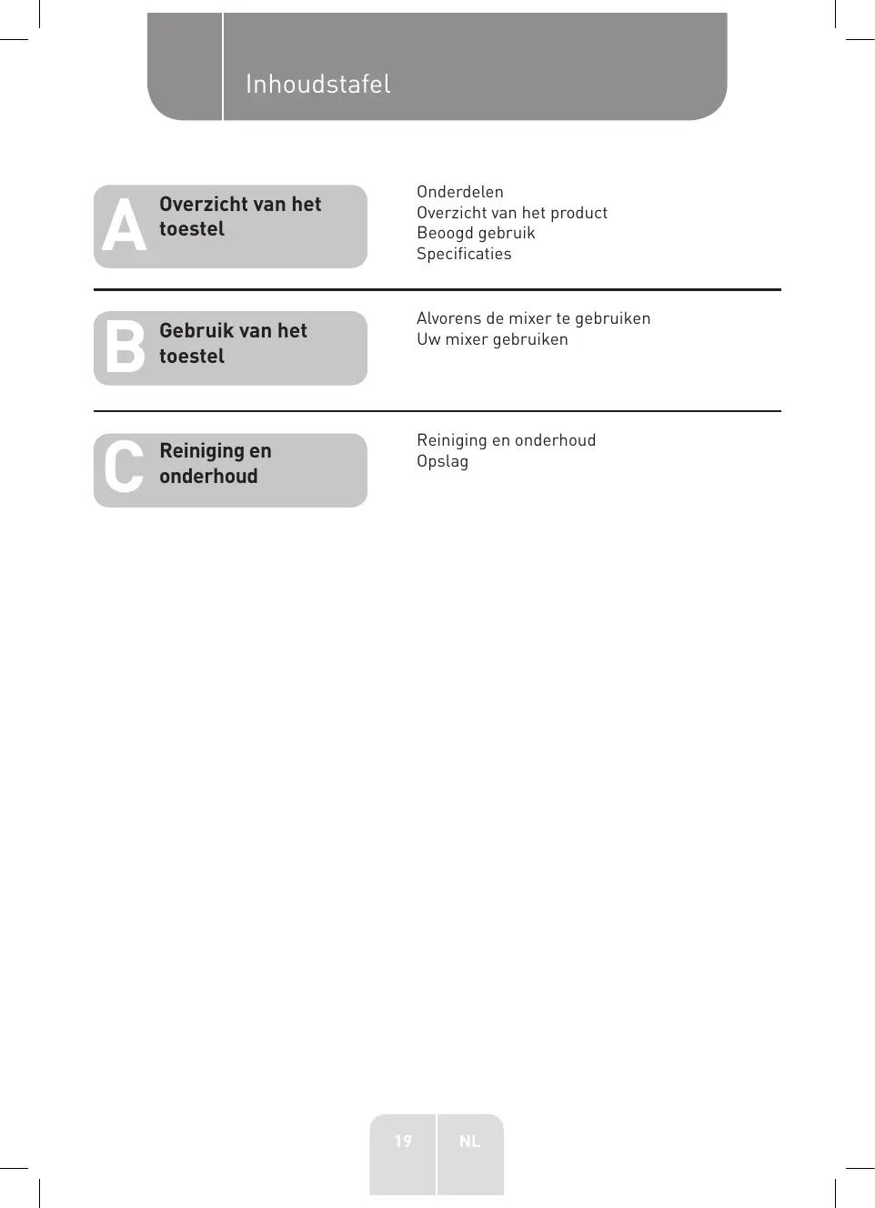 Inhoudstafel Onderdelen Overzicht van het product Beoogd gebruik Specificaties Alvorens de mixer te gebruiken Uw mixer gebruiken Reiniging en onderhoud Opslag