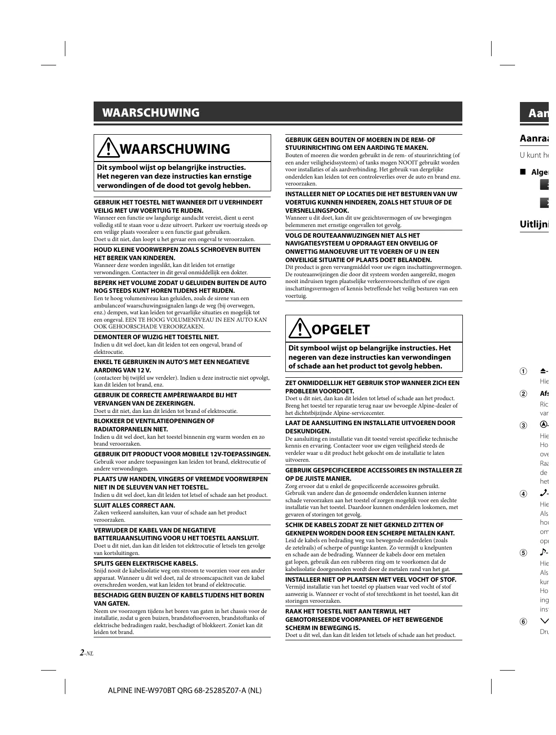 1-NL ALPINE INE-W970BT QRG 68-25285Z07-A (NL) WAARSCHUWING WAARSCHUWING Dit symbool wijst op belangrijke instructies. Het negeren van deze instructies kan ernstige verwondingen of de dood tot gevolg hebben. GEBRUIK HET TOESTEL NIET WANNEER DIT U VERHINDERT VEILIG MET UW VOERTUIG TE RIJDEN. Wanneer een functie uw langdurige aandacht vereist, dient u eerst volledig stil te staan voor u deze uitvoert. Parkeer uw voertuig steeds op een veilige plaats vooraleer u een functie gaat gebruiken. Doet u dit niet, dan loopt u het gevaar een ongeval te veroorzaken.