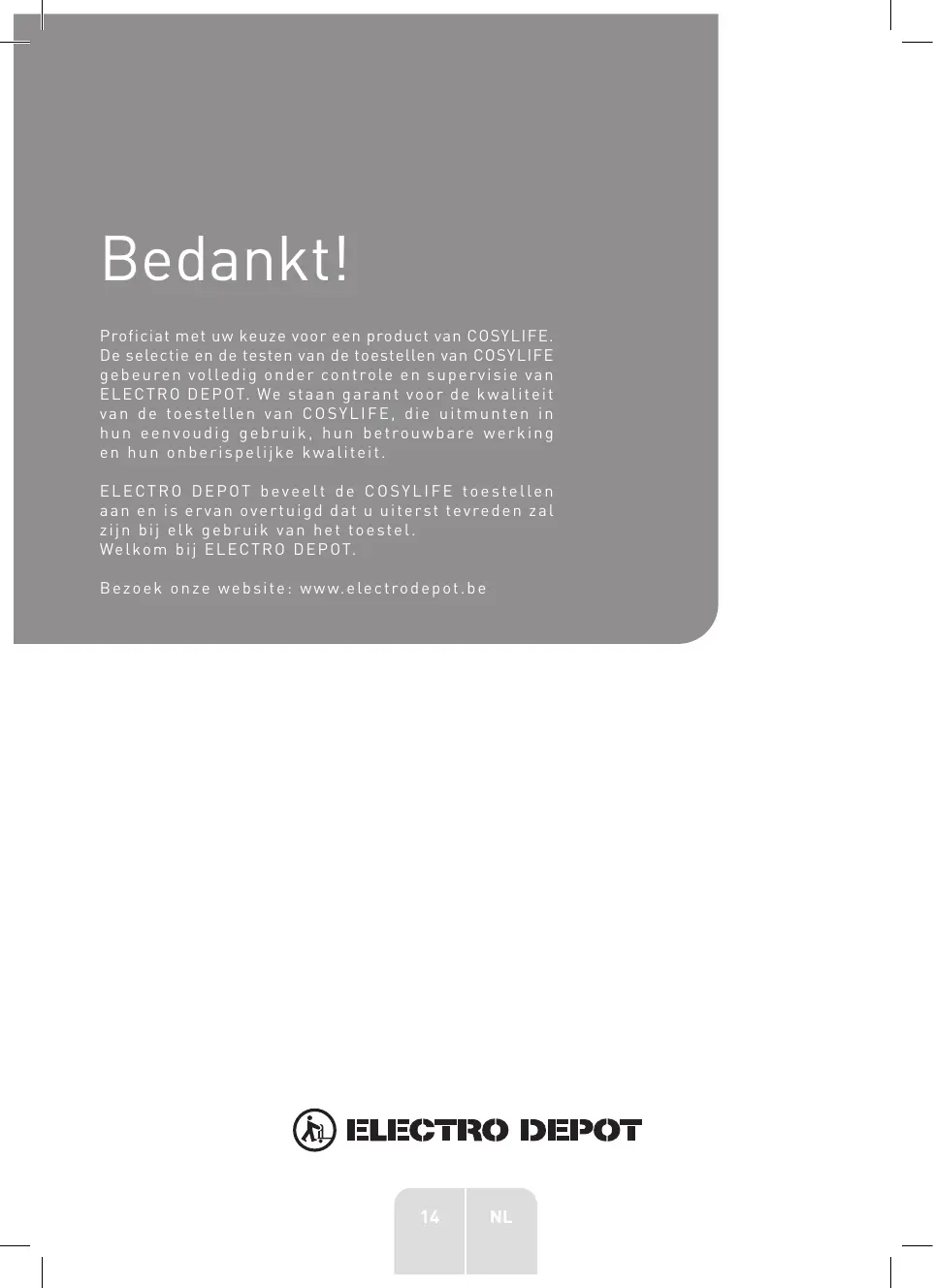 Bedankt! Proficiat met uw keuze voor een product van COSYLIFE. De selectie en de testen van de toestellen van COSYLIFE gebeuren volledig onder controle en supervisie van ELECTRO DEPOT. We staan garant voor de kwaliteit van de toestellen van COSYLIFE, die uitmunten in hun eenvoudig gebruik, hun betrouwbare werking en hun onberispelijke kwaliteit. ELECTRO DEPOT beveelt de COSYLIFE toestellen aan en is ervan overtuigd dat u uiterst tevreden zal zijn bij elk gebruik van het toestel. Welkom bij ELECTRO DEPOT Bezoek onze website: www.electrodepot.be TRO DEPOT