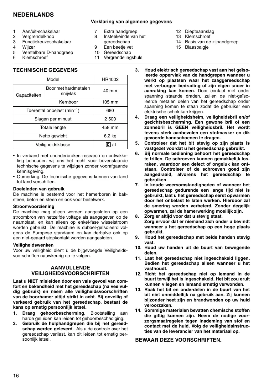 Download de handleiding voor uw Boorhamer in PDF-formaat gratis! Vind uw handleiding Hr4002 - MAKITA en neem uw elektronisch apparaat weer in handen. Op deze pagina staan alle documenten die nodig zijn voor het gebruik van uw apparaat. Hr4002 van het merk MAKITA.