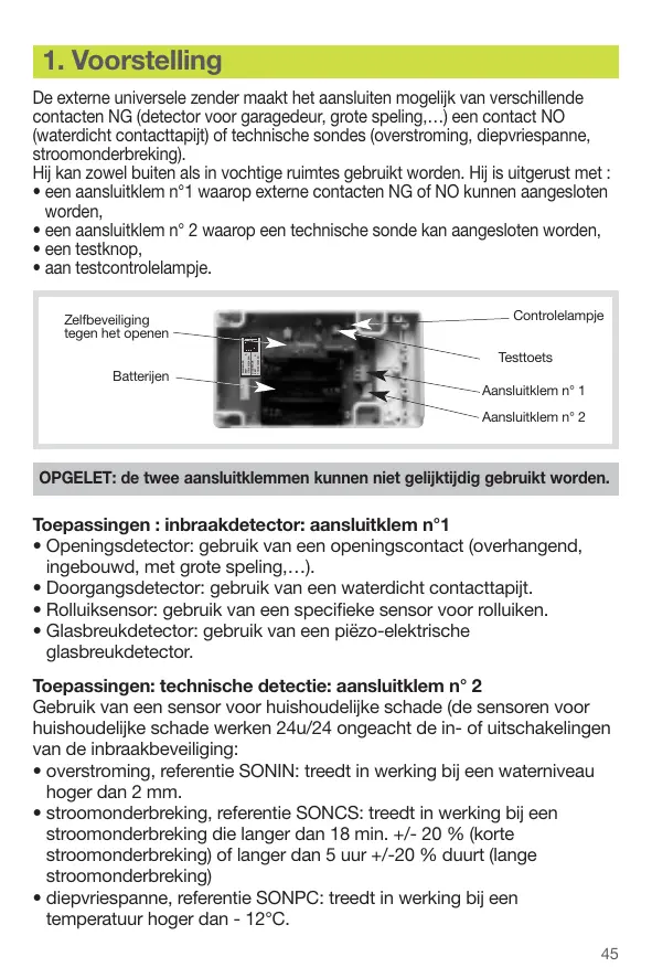 + d'un bornier n° 1 pour raccorder des contacts extérieurs NF ou NO,