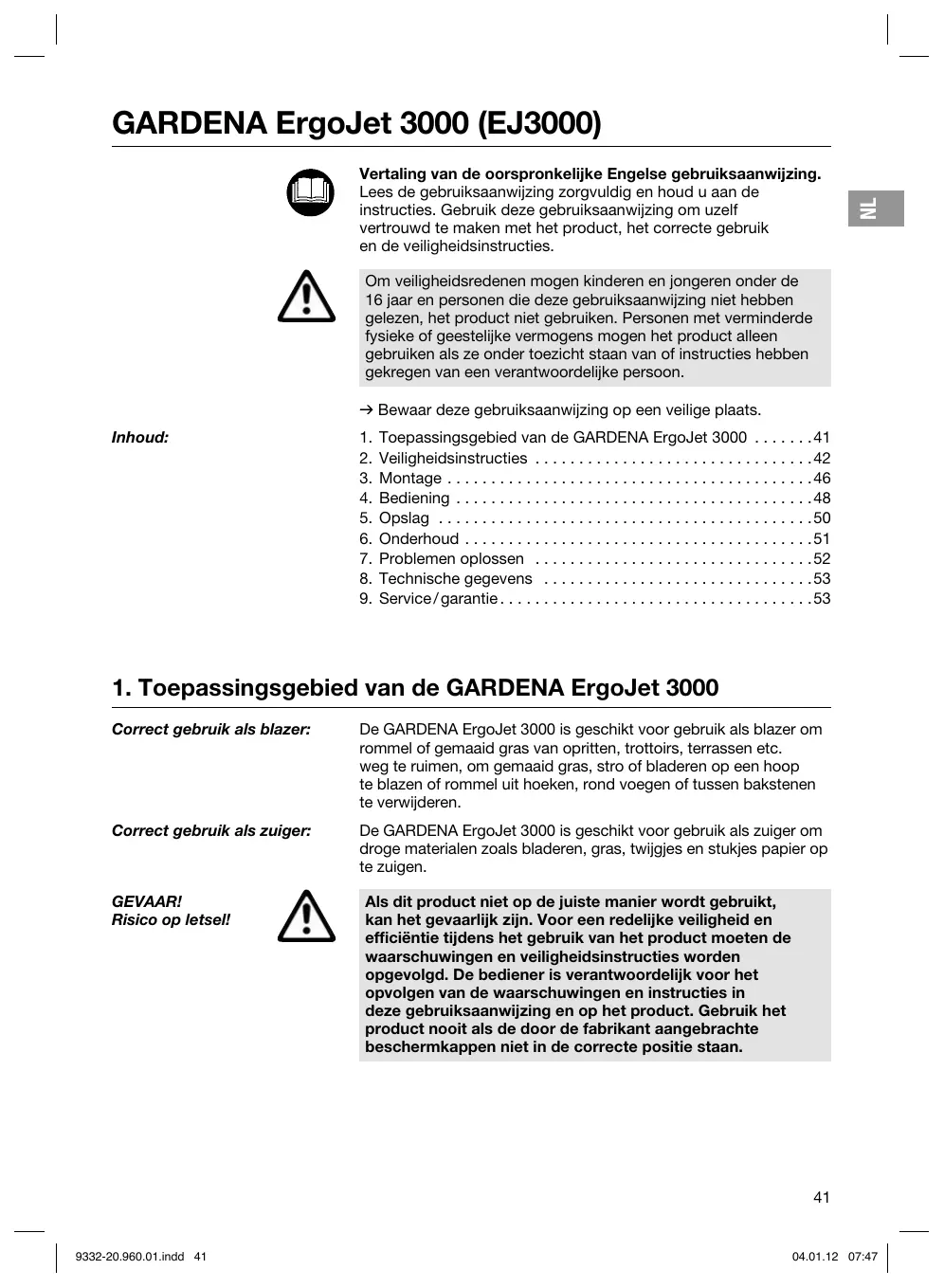 . Toepassingsgebied van de GARDENA ErgoJet 3000 . Veiligheidsinstructies . Montage .….…. . Bediening .……