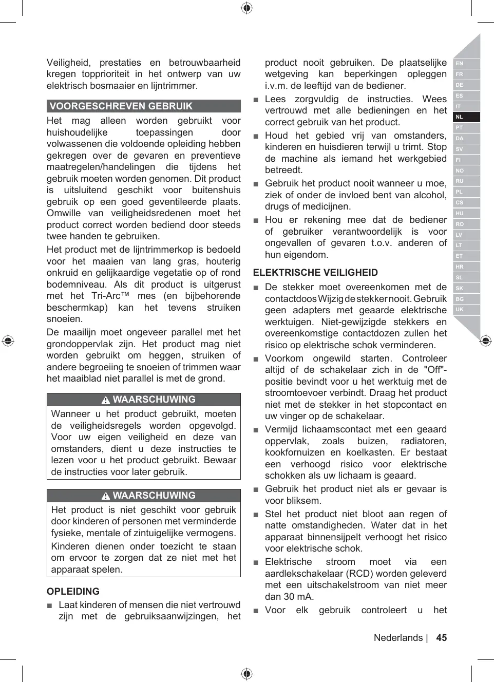 UTILISATION PRÉVUE La coupe-bordures et débrousailleuse électrique doit être utilisée seulement par des adultes ayant lu et compris les instructions et les avertissements inclus dans le présent manuel et pouvant être considérés comme responsables de leurs actes. Ce produit ne doit être utilisé qu'à l'extérieur dans une zone bien ventilée. Pour des raisons de sécurité, l'appareil doit être manipulé de manière appropriée, en utilisant les deux mains.
