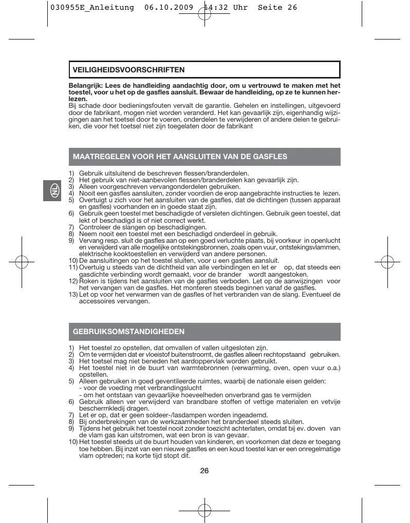 S'assurer que toutes les soupapes soient fermées avant le début du travail. Hormis la con- duite flexible et le raccord du flexible qui ont un fletage à gauche sur la poignée du brûleur, tous les autres raccords filetés ont un flletage à droite. Ne vérifier l'étanchäité de l'appareil qu'en plein air. Ne jamais rechercher une fuite en utilisant une flamme, mais recourir pour cela à une lessive savonneuse !