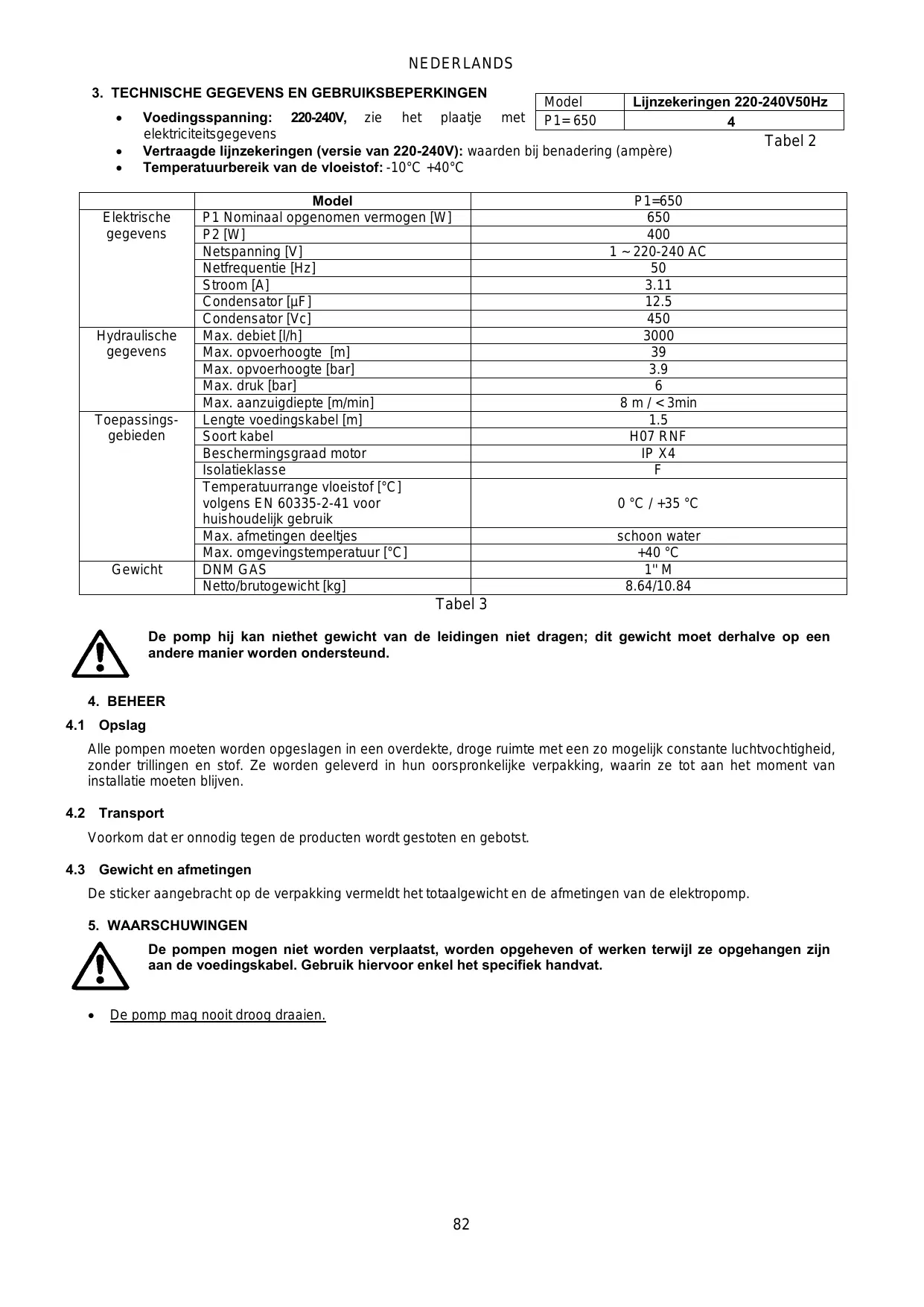 personnes, ou pour le pompage d'hydrocarbures (essence, gazole, huiles combustibles, solvants, etc.) conformément aux normes de prévention des accidents en vigueur en la matière. Avant de les ranger, il faut prévoir une étape de nettoyage. Voir chapitre « Entretien et Nettoyage ».