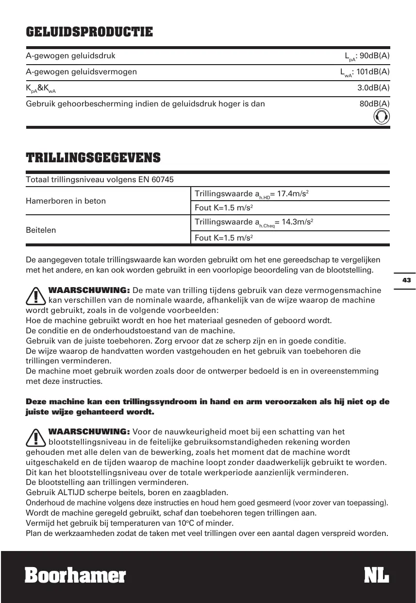 De aangegeven totale trillingswaarde kan worden gebruikt om het ene gereedschap te vergelijken met het andere, en kan ook worden gebruikt in een voorlopige becordeling van de blootstelling, 43