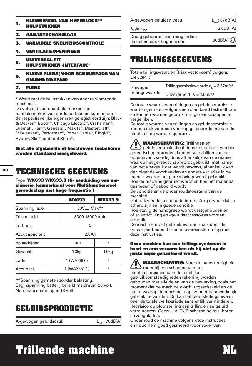 Download de handleiding voor uw Multitool in PDF-formaat gratis! Vind uw handleiding WX693 - WX693.9 - WORX en neem uw elektronisch apparaat weer in handen. Op deze pagina staan alle documenten die nodig zijn voor het gebruik van uw apparaat. WX693 - WX693.9 van het merk WORX.