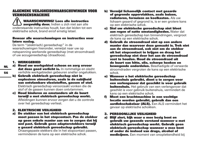 propices aux accidents. b) Ne pas faire fonctionner les outils électriques en atmosphère explosive, par exemple en présence de liquides inflammables, de gaz ou de poussières. Les outils électriques produisent des