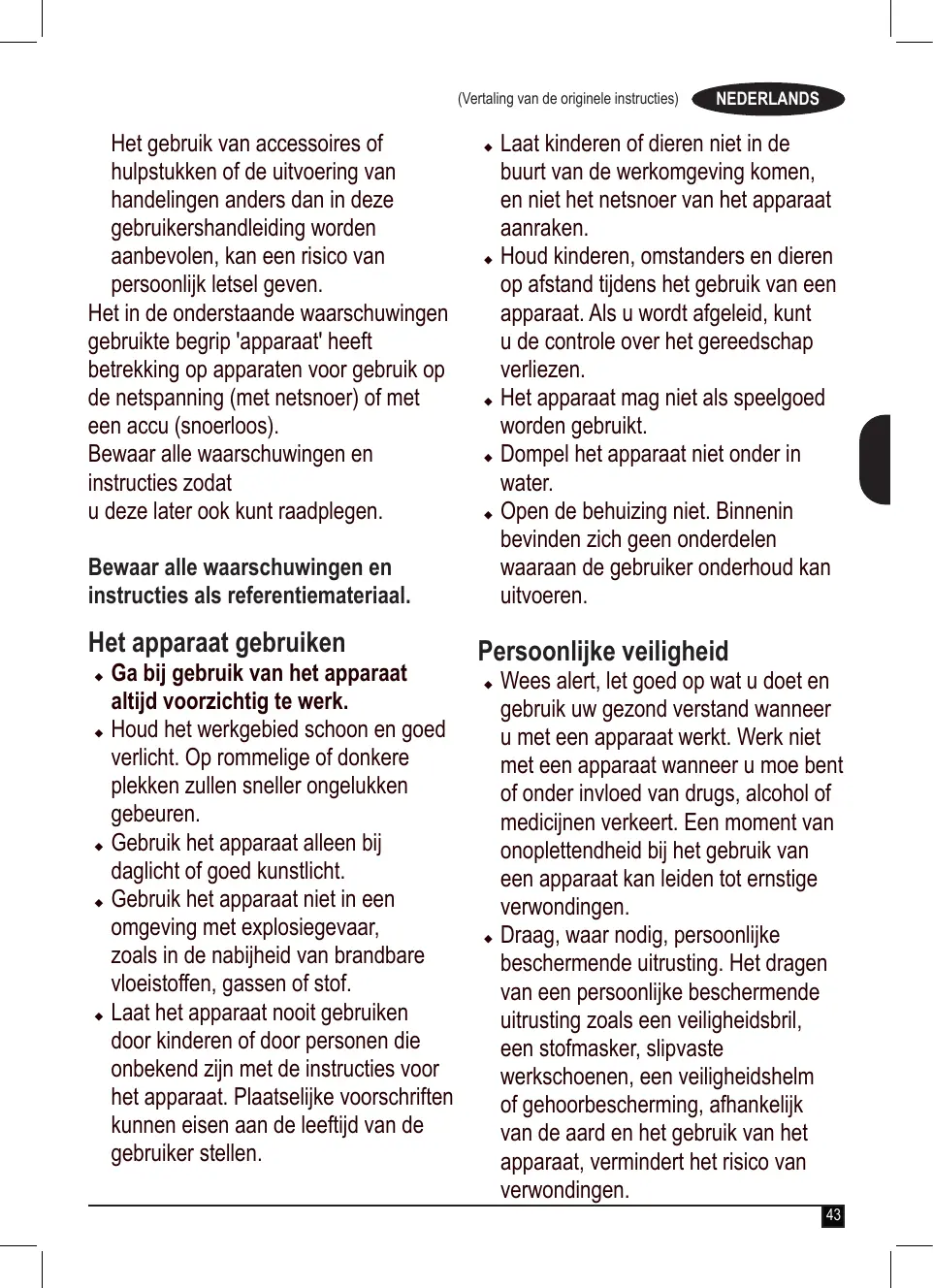 éloignés pendant que vous utilisez l'appareil. Toute distraction peut vous faire perdre le contrôle de l'outil.