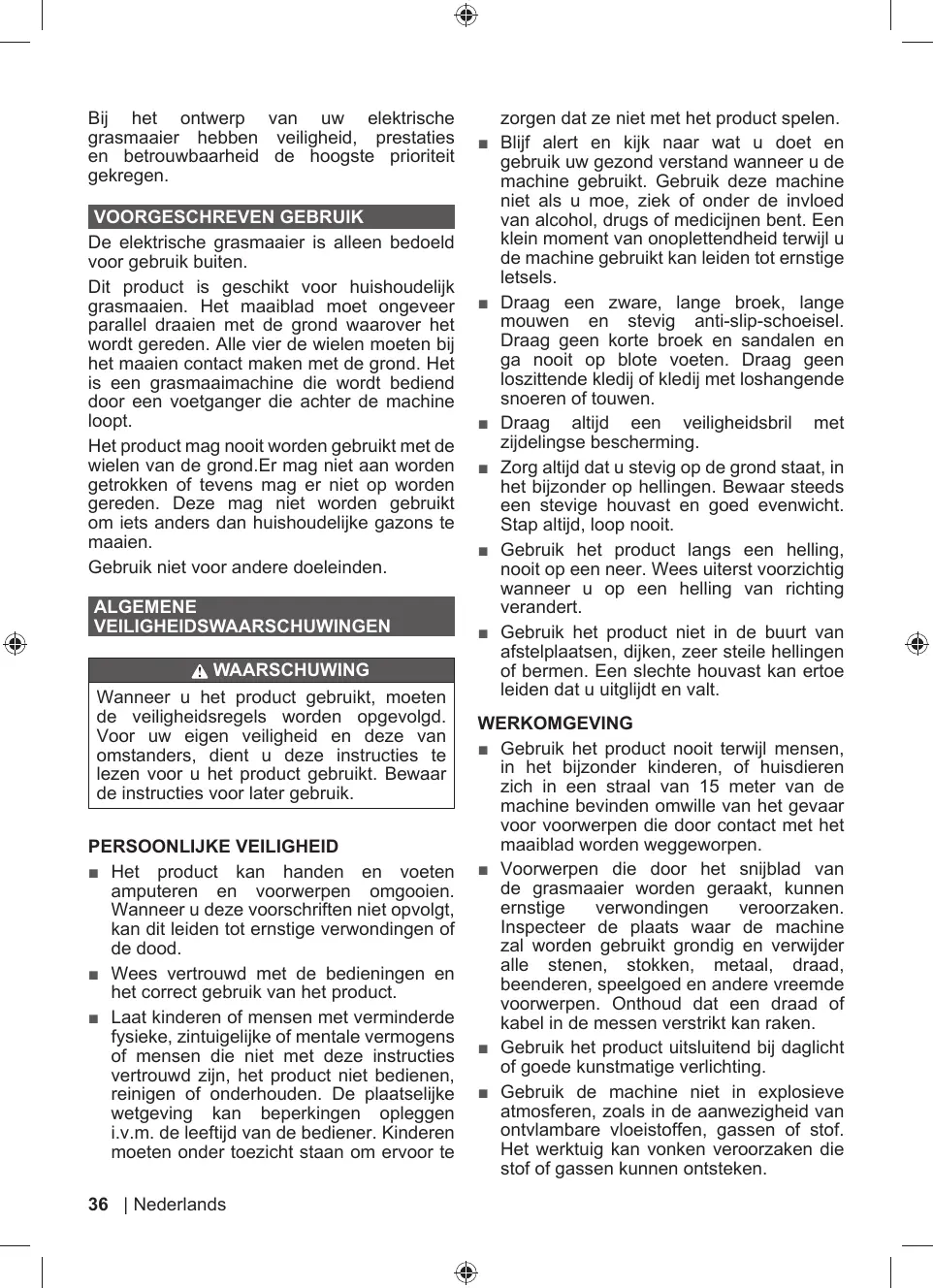 = La tondeuse à gazon est capable d'amputer les mains et les pieds, ainsi que de projeter des objets. Le non-respect de toutes les règles de sécurité est susceptible d'entraîner des blessures graves voire mortelles.