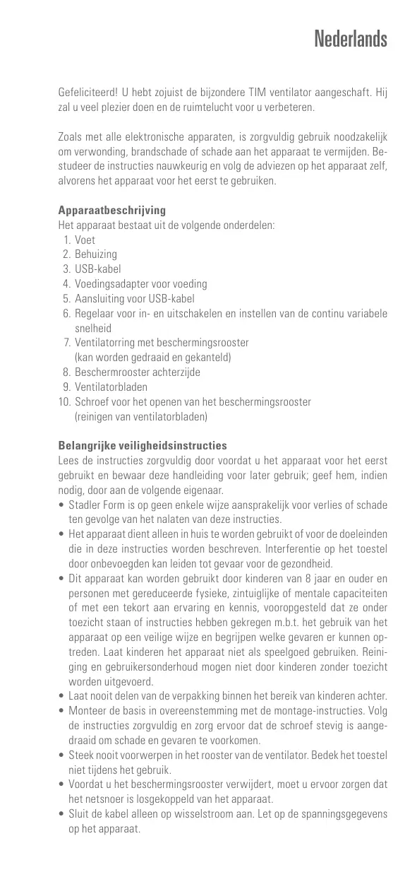 {reinigen van ventilatorbladen) Belangrijke veiligheidsinstructies Lees de instructies zorgvuldig door voordat u het apparaat voor het eerst gebruikt en bewaar deze handleïding voor later gebruik: geef hem, indien nodig, door aan de volgende eigenaar. + Stadler Form is op geen enkele wijze aansprakelik voor verlies of schade ten gevolge van het nalaten van deze instructies. Het apparaat dient alleen in huis te worden gebruikt of voor de doeleinden die in deze instructies worden beschreven. Interferentie op het toestel door anbevoegden kan leïden tot gevaar voor de gezondheid. Dit apparaat kan worden gebruikt door kinderen van 8 jaar en ouder en persanen met gereduceerde fysieke, zintuiglike of mentale capaciteiten of met een tékort aan ervaring en kennis, vooropgesteld dat ze onder toezicht staan of instructies hebben gekregen mb. het gebruik van het apparaat op een veilige wijze en begriipen welke gevaren er kunnen op- treden. Laat kinderen het apparaat niet als speelgoed gebruiken. Reini- ging en gebruikersonderhoud mogen niet door kinderen zonder tozicht worden uitgevoerd Laat nooît delen van de verpakking binnen het bereik van kinderen achter. Monteer de basis in overeenstemming met de montage-instructies. Volg de instructies zorgvuldig en zorg ervoor dat de schroef stevig is aange- draaid om schade en gevaren te voarkomen: Steek nooit voorwerpen in het rooster van de ventilator. Bedek het toestel niet tjdens het gebruik. Voordat u het beschermingsrooster verwijdert, moet u ervoor zorgen dat het netsnoer is losgekoppeld van het apparaat Sluit de kabel alleen op wisselstroom aan. Let op de spanningsgegevens op het apparaat.
