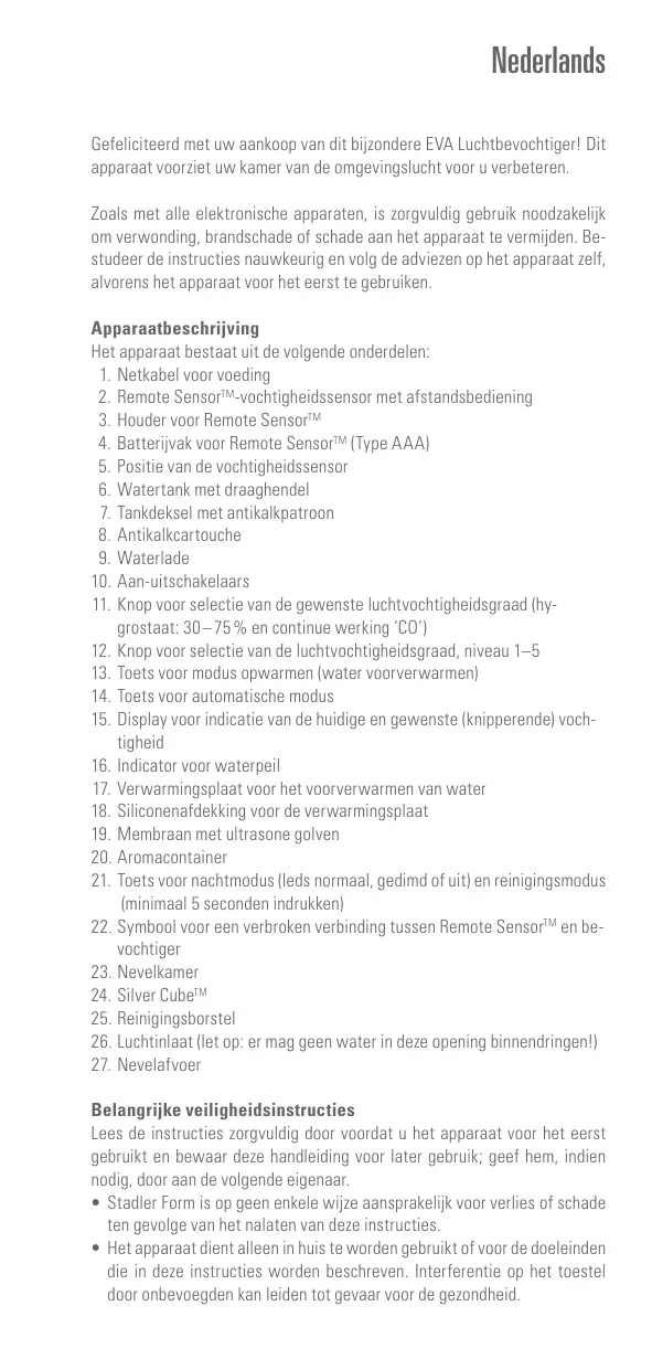 Belangrijke veiligheidsinstructies Lees de instructies zorgvuldig door voordat u het apparaat voor het eerst gebruikt en bewaar deze handleiding voor later gebruik: geef hem, indien nodig, door aan de volgende eigenaar. + Stadler Form is op geen enkele wijze aansprakelik voor verlies of schade ten gevolge van het nalaten van deze instructies. + Het apparaat dient alleen in huis te worden gebruikt of voor de doeleinden die in deze instructies worden beschreven. Interferentie op het toestel door anbevoegden kan leiden tot gevaar voor de gezondheid.