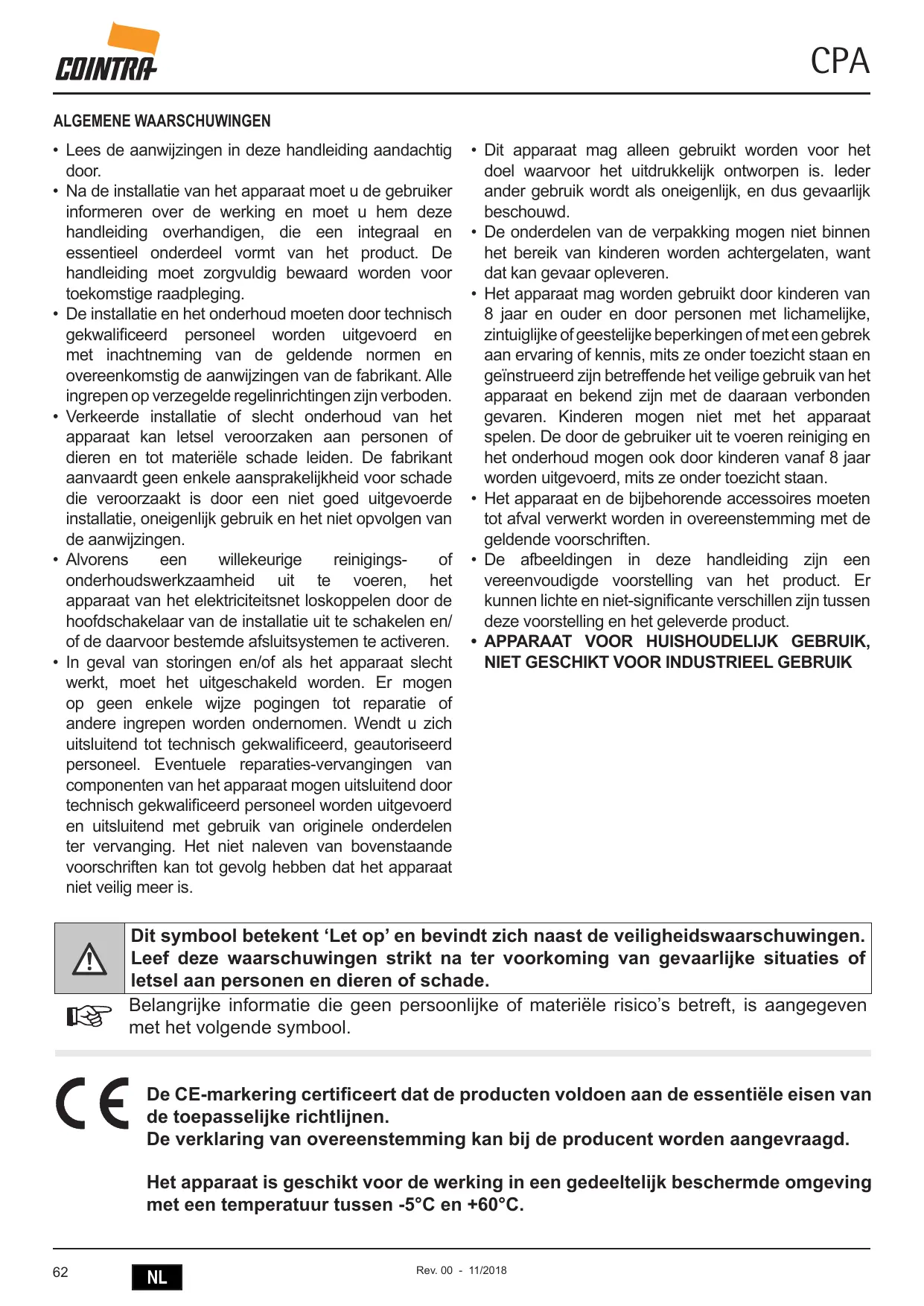 NIET GESCHIKT VOOR INDUSTRIEEL GEBRUIK A Dit symbool betekent ‘Let op’ en bevindt zich naast de veiligheidswaarschuwingen. Leef deze waarschuwingen strikt na ter voorkoming van gevaarlijke situaties of letsel aan personen en dieren of schade.