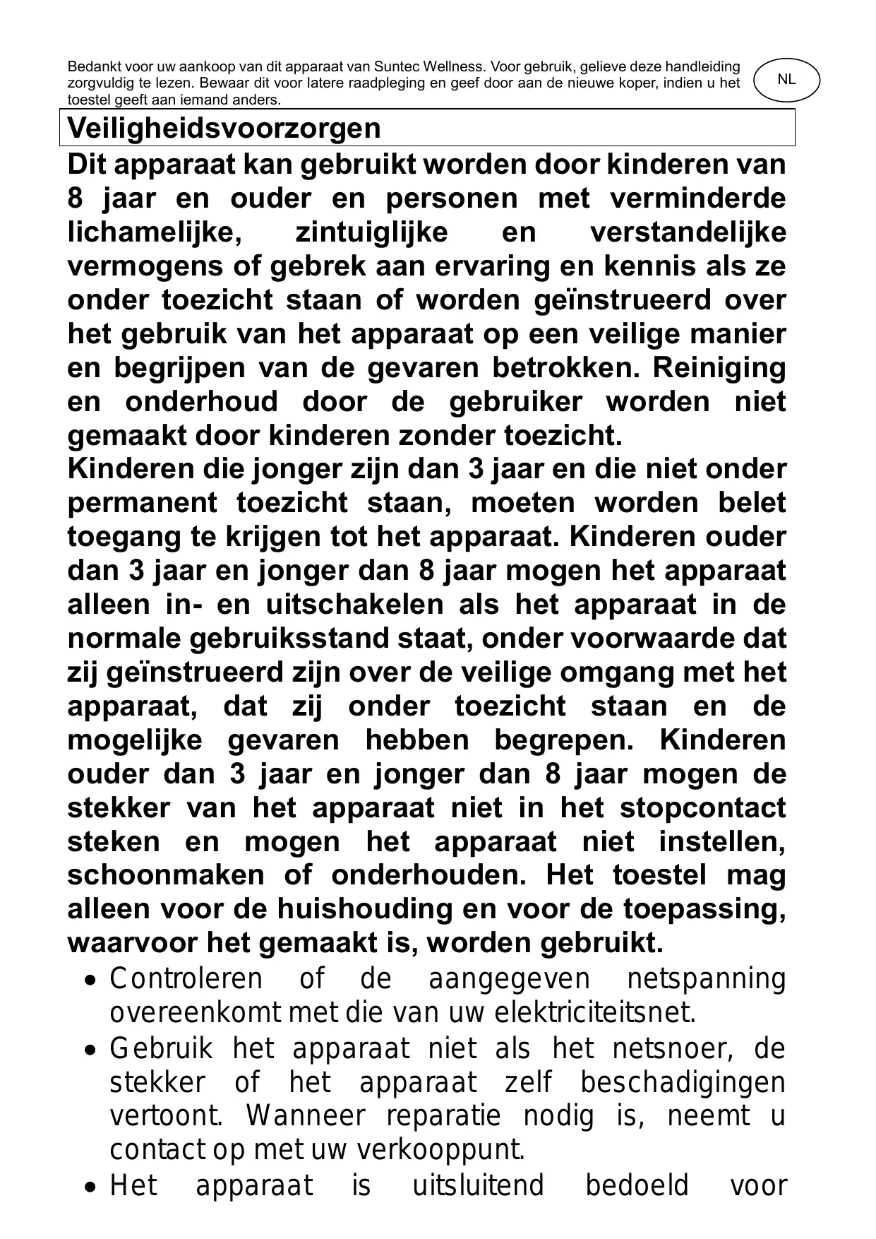 En caso de que necesite asistencia técnica, péngase en contacto con su distribuidor especializado. Denominacién del producto: Nümero de serie: Nombre del comprador: Fecha de compra: Sello y firma del distribuidor especializado: Fabricante: Nous nous engageons de remettre en état votre appareil gratuitement pendant la période de garantie de 24 mois ou alors de mettre à disposition les pièces détachées gratuitement à votre commerçant spécialisé, si votre appareil devait défaillir en raison d'une erreur de fabrication ou d'un vice de matériel côté production. Toute revendication à notre encontre allant au-delà est exclue. Nous n’assumons pas de responsabilité pour des endommagements dans des cas de force majeure, en cas de manipulation incorrecte, en cas de non-respect de la notice, en cas d'usure due au fonctionnement ou pour des dommages survenus sur le chemin du transport. Ce certificat est uniquement valable avec la facture correspondante. En cas d'intervention de service, veuillez ramener le produit acheté à votre commerçant spécialisé. Désignation de l’article : Numéro de série : Nom de l'acheteur : Date de l’achat : Cachet et signature du commerçant spécialisé : Fabricant : Suntec Wellness GmbH HolzstraRe 2