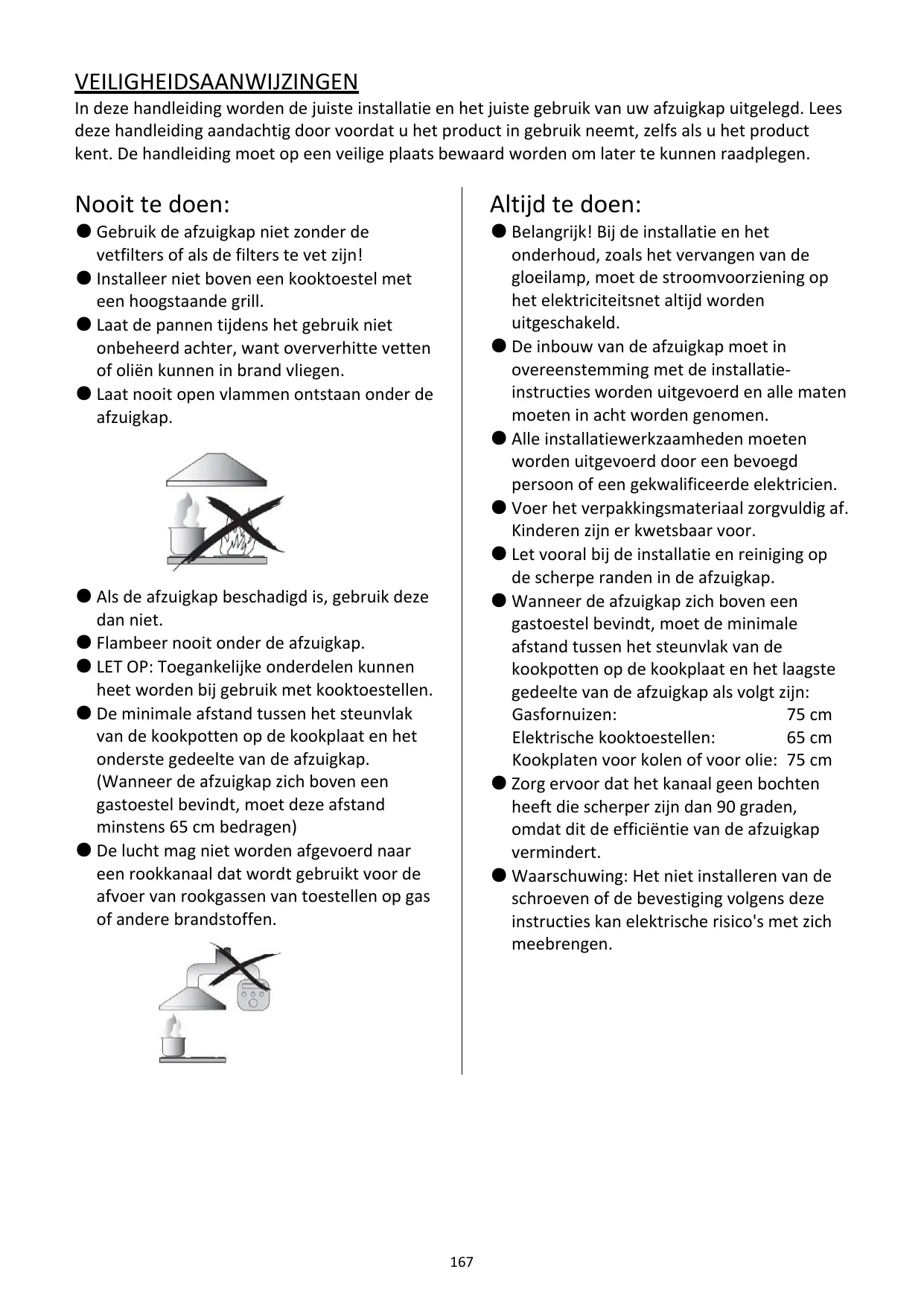 e Quand la hotte aspirante est située au- dessus d’une cuisinière, la distance minimale entre la surface de support pour les récipients de cuisson sur la plaque de cuisson et la partie la plus basse de la hotte aspirante doit être la suivante : Cuisinières à gaz : 75 cm Cuisinières électriques : 65cm Cuisinières à charbon ou à mazout: 75 cm
