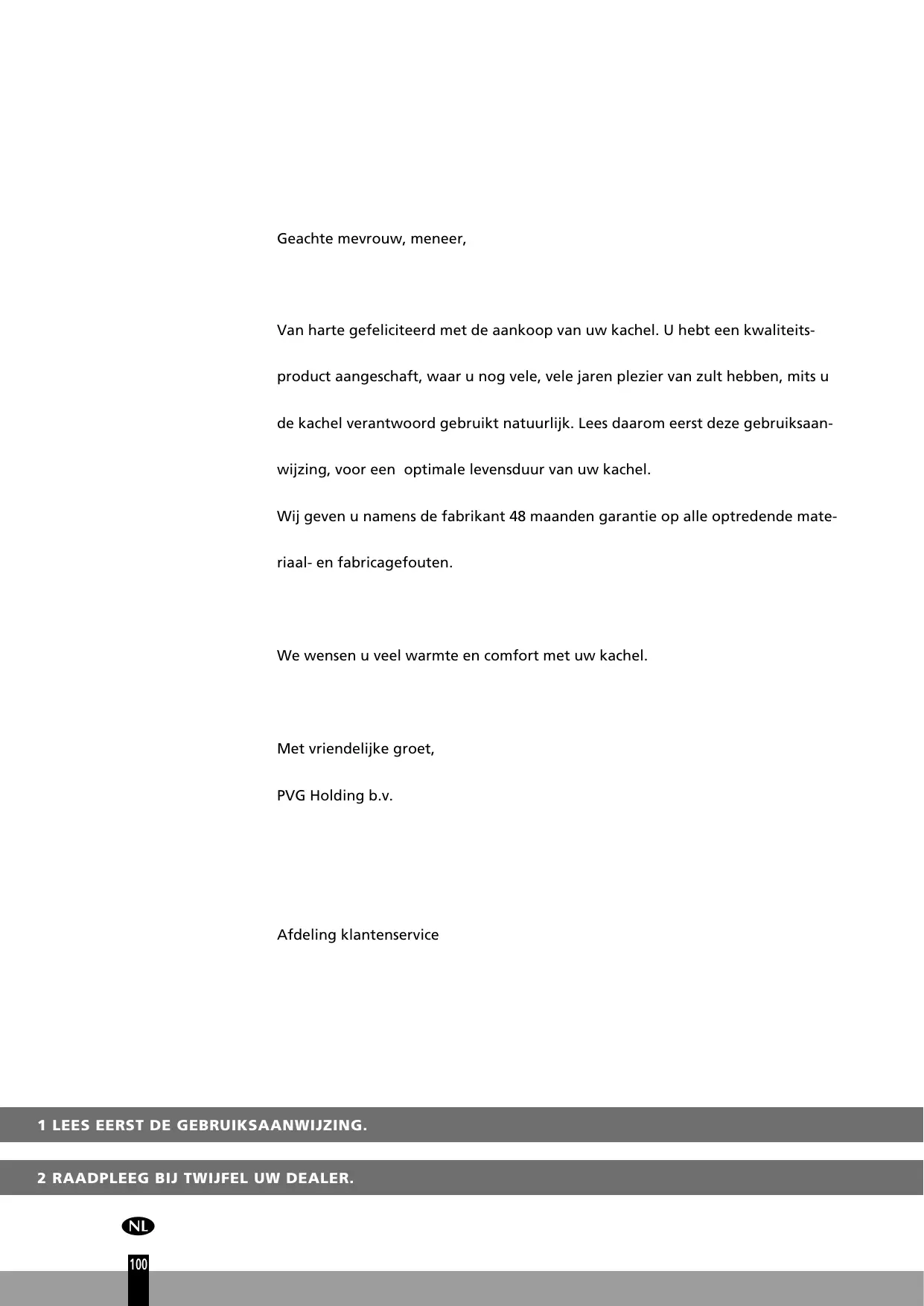 Van harte gefeliciteerd met de aankoop van uw kachel. U hebt een kwaliteits- product aangeschaft, waar u nog vele, vele jaren plezier van zult hebben, mits u de kachel verantwoord gebruikt natuurlijk. Lees daarom eerst deze gebruiksaan- Wijzing, voor een optimale levensduur van uw kachel.