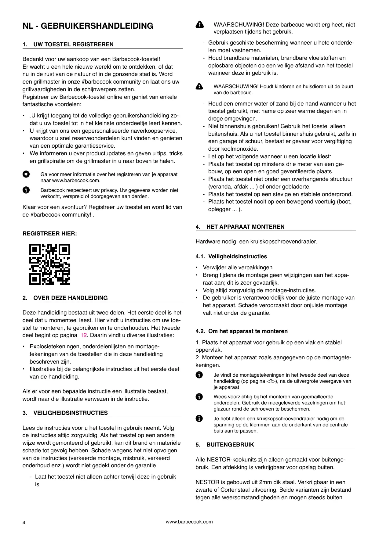 12.4. CONDITIONS DE GARANTIE Une garantie de 2 ans s'applique aux matériaux et à la con- struction de tous les éléments en acier de tous les appareils de cuisson NESTOR. Pour l'enregistrement correct de vos produits NESTOR, veuillez consulter le site https:/{www.barbe- cook.com/en/accounts/.