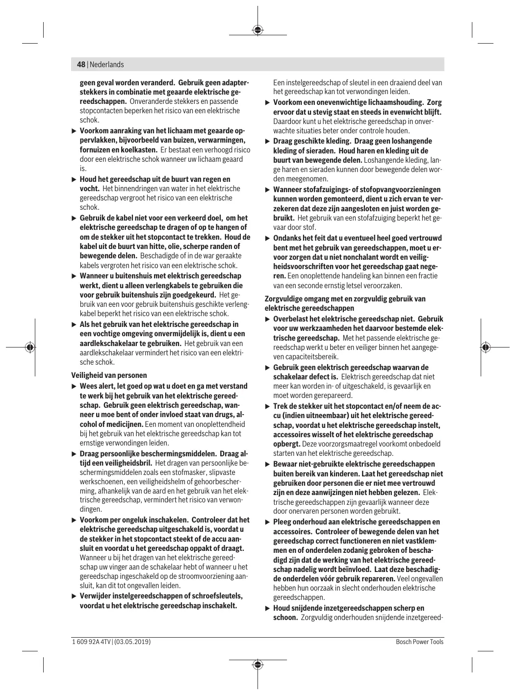 L L L L L Veiligheid van personen > Wees alert, let goed op wat u doet en ga met verstand te werk bij het gebruik van het elektrische gereed- schap. Gebruik geen elektrisch gereedschap, wan- neer u moe bent of onder invloed staat van drugs, al- cohol of mediciinen. Een moment van onoplettendheid bij het gebruik van het elektrische gereedschap kan tot ernstige verwondingen leiden.