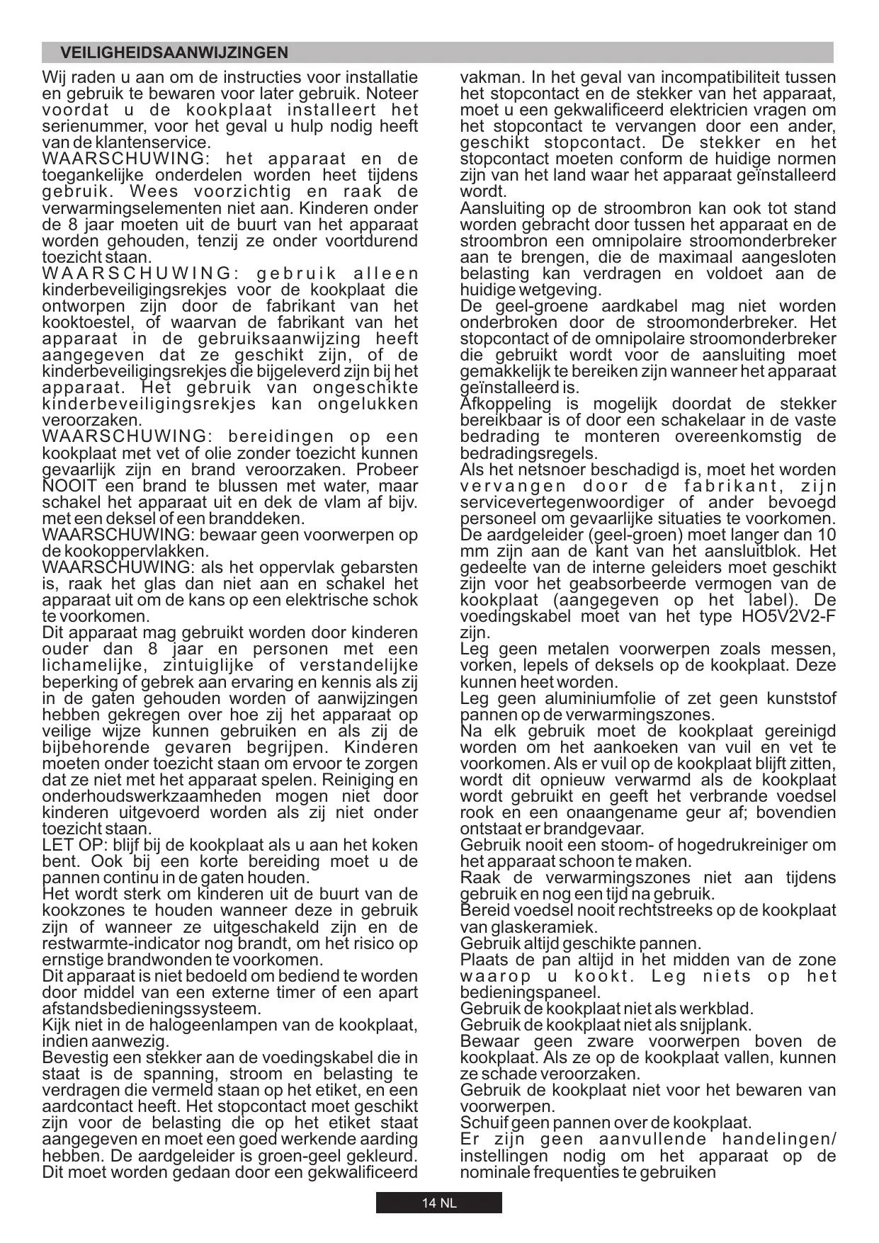 AVERTISSEMENT : l'appareil et ses parties accessibles chauffent pendant l'utilisation. Évitez de toucher les éléments chauffants. Les enfants de moins de 8 ans doivent être tenus hors de portée de l'appareil, sauf s'ils sont surveillés en permanence. AVERTISSEMENT : n'utilisez qu'un dispositif de rotection de votre table de cuisson conçu par le abricant de votre appareil ou indiqué, dans le manuel d'utilisation, comme étant compatible, ou bien le dispositif de protection fourni avec l'appareil. L'utilisation d'un dispositif de protection non approprié peut causer des accidents. AVERTISSEMENT : l'utilisation de la table de cuisson sans surveillance avec manipulation de graisse ou d'huile peut être dangereux et provoquer un incendie. N'essayez JAMAIS d'éteindre un feu avec de l'eau, mais éteignez l'appareil, puis couvrez la flamme avec un couvercle ou une couverture anti-feu, par exemple. AVERTISSEMENT, risque d'incendie : ne stockez pas d'éléments sur les surfaces de cuisson. AVERTISSEMENT : si la surface est fissurée, ne touchez pas le verre de la table et éteignez l'appareil pour éviter tout risque d'électrocution. Cet appareil peut être utilisé par des enfants âgés de 8 ans et plus, par des personnes dont les capacités physiques, sensorielles ou mentales sont réduites où par des personnes dénuées d'expérience et de connaissances, mais qui ont été informées sur la manière d'utiliser l'appareil en toute sécurité, si elles comprennent les risques impliqués. Surveillez les enfants afin qu'ils ne jouent pas avec l'appareil. L'entretien et le nettoyage ne doivent pas être effectués par des enfants sans surveillance. ATTENTION la cuisson demande d'être surveillée. Les cuissons de courte durée doivent être surveillées en permanence. Il est chaudement recommandé d'éloigner les enfants de la zone de cuisson lorsqu'elle fonctionne ou même quand elle est éteinte, mais que l'indicateur de chaleur résiduelle est encore Visible, afin d'éviter tout risque de brûlures graves. Cet appareil n'est pas conçu pour être actionné par un temporisateur extèrne ou un système séparé de commande à distance. Si votre table de cuisson est dotée d'éléments halogènes, n'en fixez pas la lumière. Brancher le câble d'alimentation sur une prise de courant qui supporte le voltage (le courant et la charge sont indiqués sur l'étiquette) et vérifier la présence d'une mise à la terre. La prise d'alimentation doit supporter la charge indiquée sur l'étiquette et être dotée d'une mise à la terre en état de fonctionnement. Le câble conducteur de mise à la terre est jaune et vert. Cette opération doit être exécutée par du personnel qualifié. En cas d'incompatibilité entre la prise d'alimentation et la fiche du câble de l'appareil, demander à un électricien professionnel de remplacer la prise d'alimentation par un dispositif compatible. La