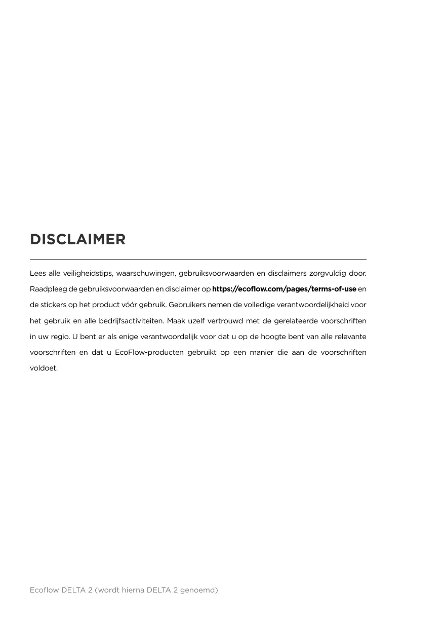 clause de non-responsabilité disponibles sur le site https://ecoflow.com/pages/terms-of-use ainsi qu'aux autocollants apposés sur le produit avant l'utilisation. L'utilisateur assume l'entière responsabilité de l'utilisation et du fonctionnement. Familiarisez-vous avec les réglementations en vigueur dans votre région. Il vous incombe de connaître toutes les réglementations