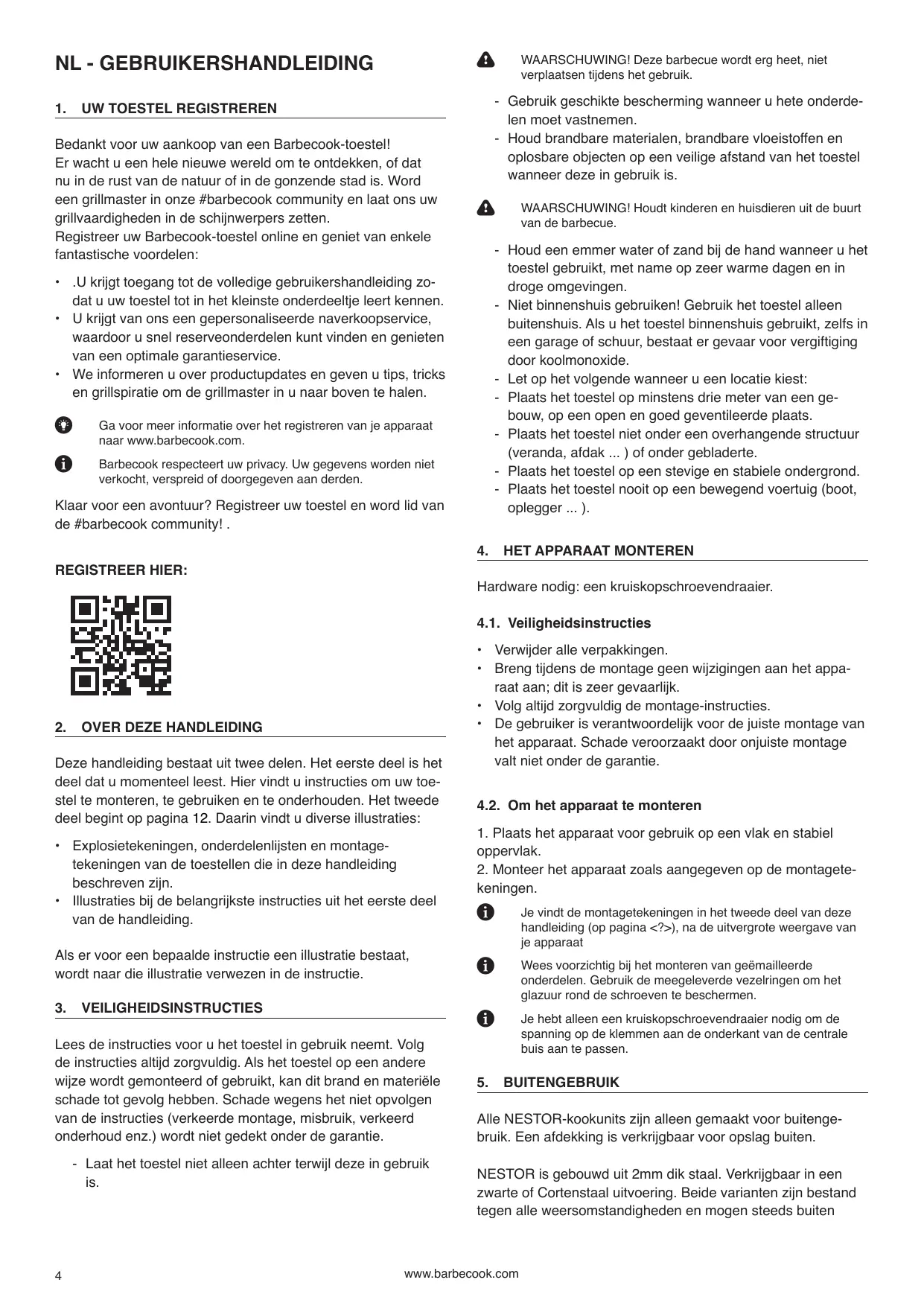 12.4. CONDITIONS DE GARANTIE Une garantie de 2 ans s'applique aux matériaux et à la con- struction de tous les éléments en acier de tous les appareils de cuisson NESTOR. Pour l'enregistrement correct de vos produits NESTOR, veuillez consulter le site https:/{www.barbe- cook.com/en/accounts/.