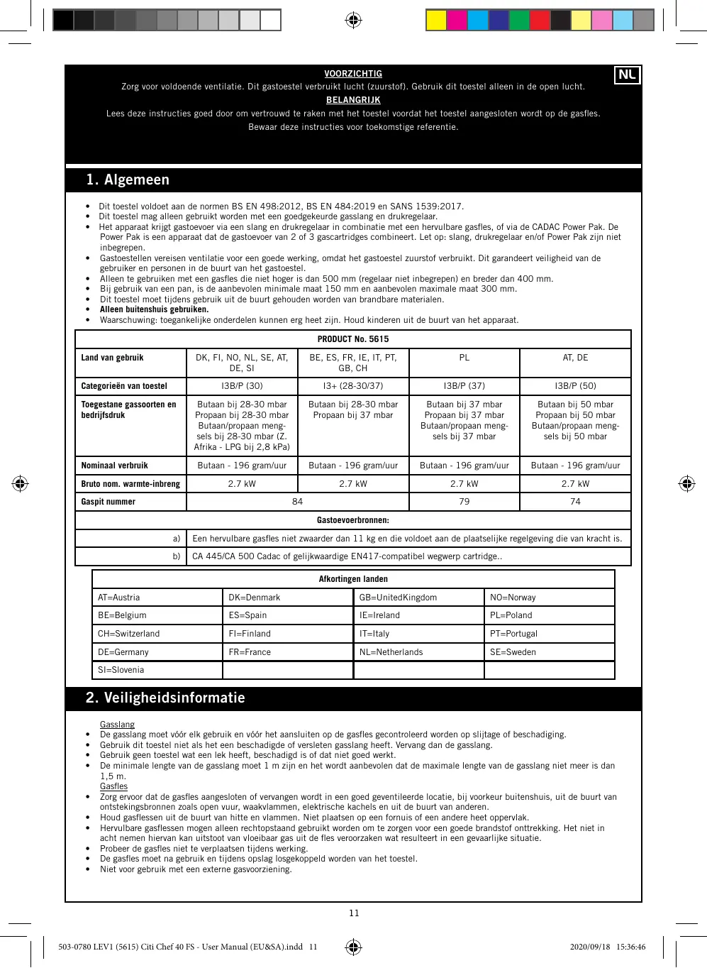 + Lors de l'utilisation d'une casserole, sa taille doit être comprise entre 150 mm el 300 mm + Get appareil doit être tenu éloigné de toute matière inflammable durant son utilisation + À utiliser exclusivement en extérieur. + _Httention: les parties accessibles peuvent âtre extrêmement chaudes. Tenir les jeunes enfants à l'écart PRODUCT No. 5615 Pays d'utilisation DK, FI, NO, NL, SE, AT, BE, ES, FR, IE, IT, PT, PL AT, DE DE, Si GE, ch Abréviations des noms de pays HT=Autriche DK=Danemark GB-Royaume-Uni NO=Norvége BE-Belgique ES=Espagne IEzirelande PL=Pologne N'utilisez pas un appareil qui fuit, qui est endommagé ou qui ne fonctionne pas correctement.