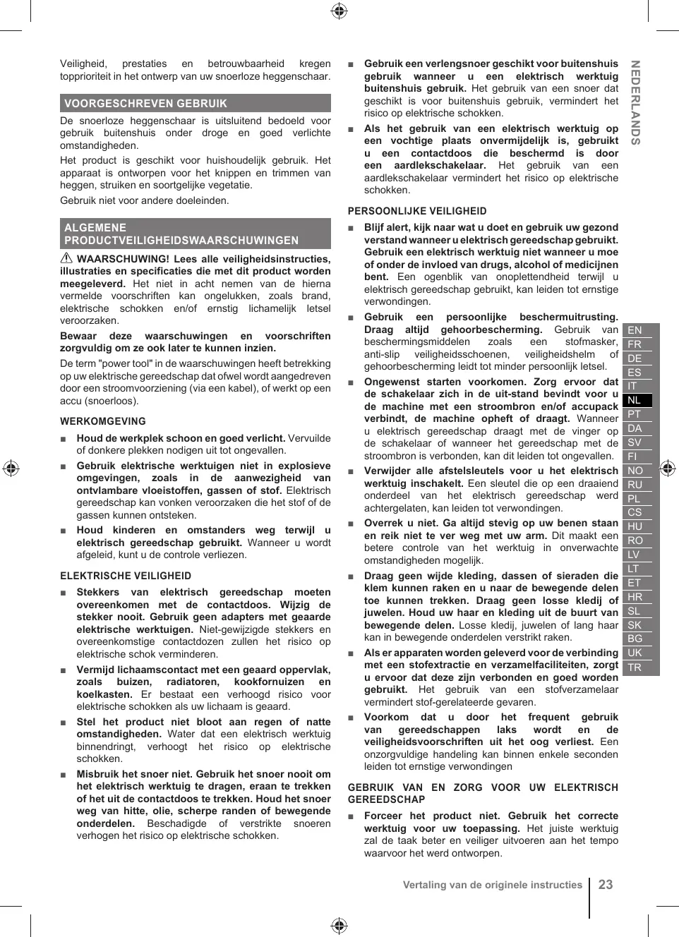 = Tenez le taille-haie uniquement au niveau des surfaces de saisie isolées. Sa lame pourrait entrer en contact avec des branchements dissimulés. Le contact entre les lames et un fil sous tension peut rendre conductrices les parties métalliques exposées du taille- haies et envoyer une décharge électrique à l'opérateur.