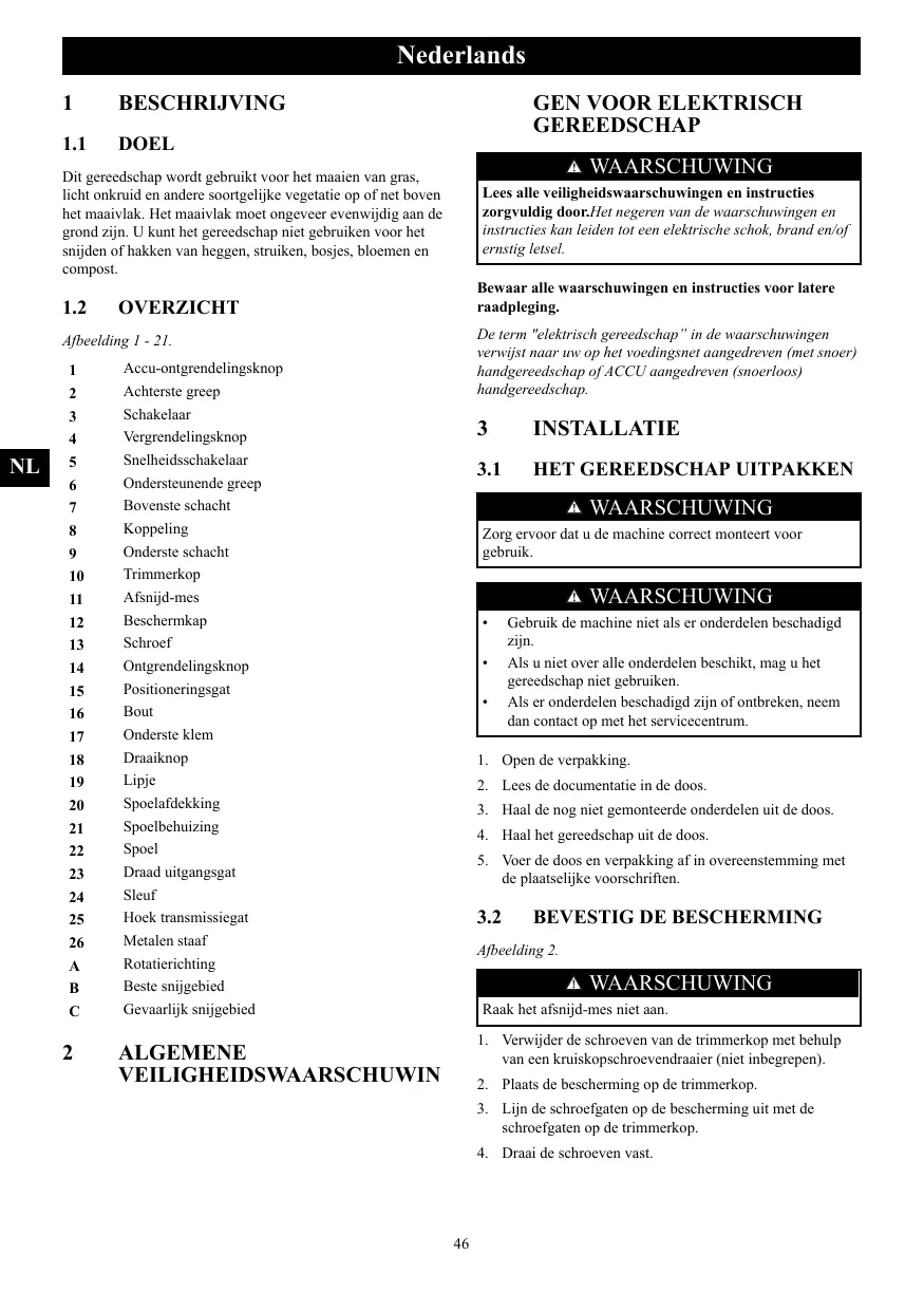 Directives CE suivantes + 201430/EU + 2000/14/CE & 2005/88/CE + 2011/65/EU & (EU)2015/863 En outre, nous déclarons que les (parties /clauses de) normes harmonisées suivantes ont été appliquées Plaats de spoel in de spoelbehuizing. Plaats de spoelafdekking op de trimmerkop. Druk de spoelafdekking totdat deze op zijn plaats klikt