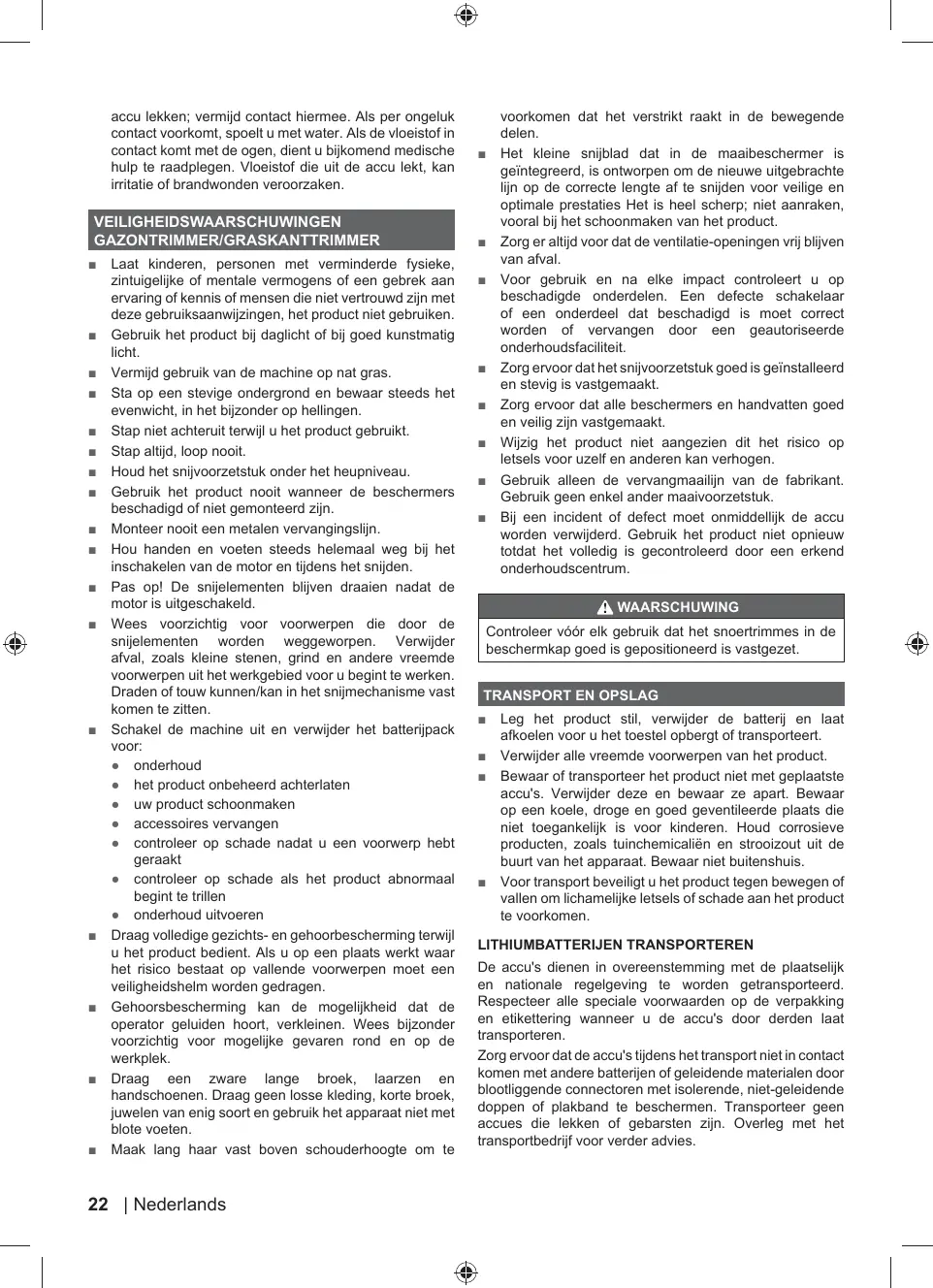 Débarrassez l'appareil de tous les corps étrangers. N'entreposez et ne transportez pas le produit équipé d'une batterie. Retirez-la et fixez-la séparément. Rangez-le dans un endroit frais, sec et correctement ventilé, hors de portée des enfants. Ne le rangez pas à proximité d'agents corrosifs tels que des produits chimiques de jardinage ou des sels de dégel. Ne le rangez pas à l'extérieur. = Pour le transport, attachez le produit pour l'empêcher de bouger ou de tomber, afin d'éviter toute blessure et tout dommage matériel.