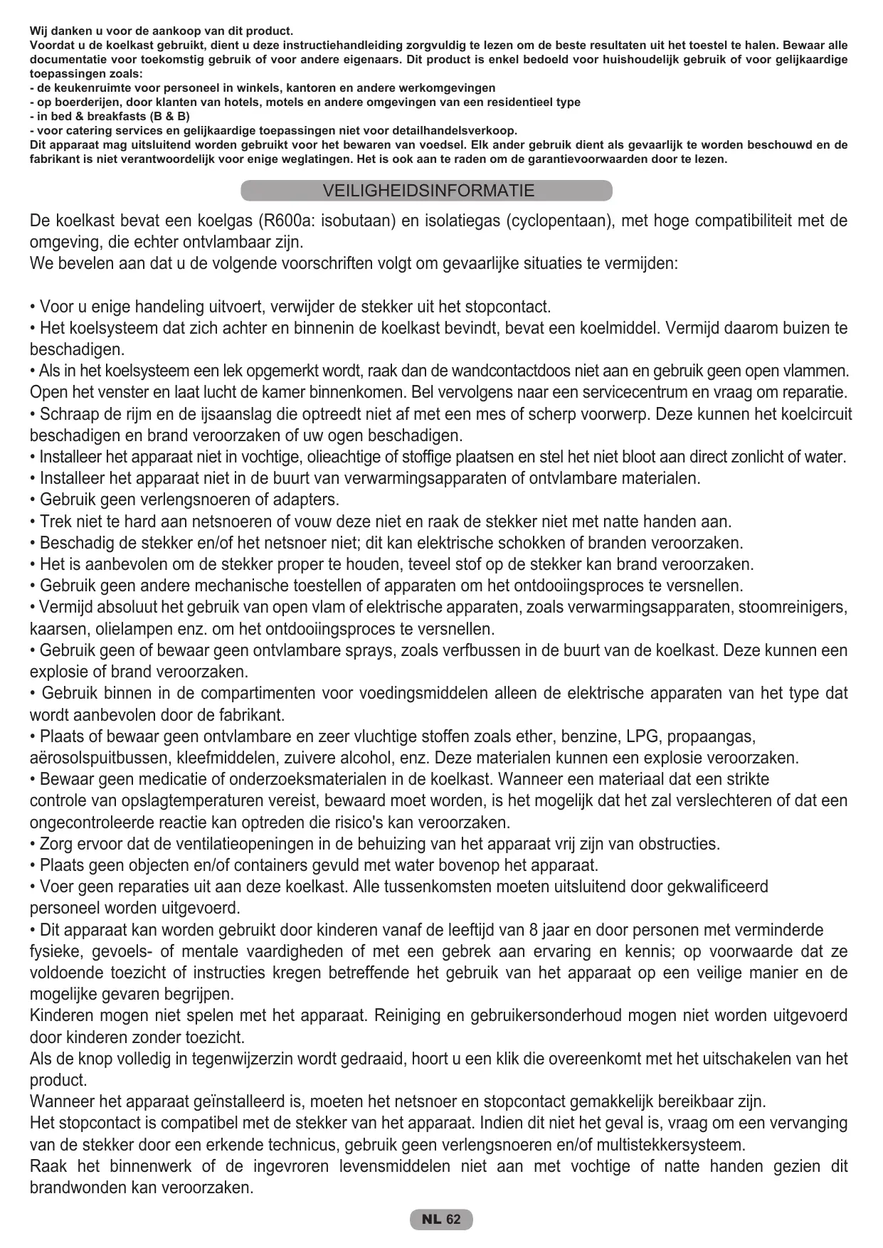 INFORMATIONS SUR LA SECURITE Le réfrigérateur contient un gaz réfrigérant (R660a : isobutane) et un gaz isolant (cyclopentane), dotés d'une compatibilité