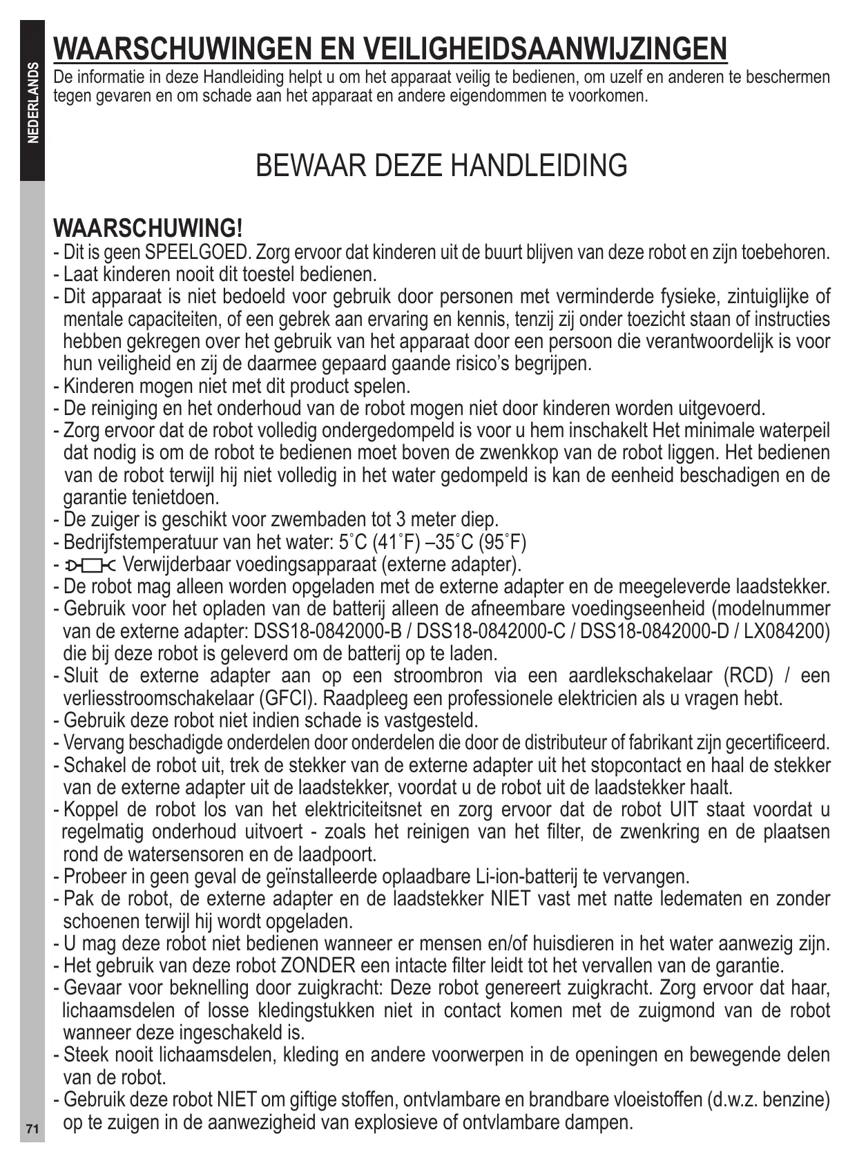 - Vous ne devez pas utiliser ce robot lorsque des personnes et / ou des animaux domestiques sont présents dans l'eau.
