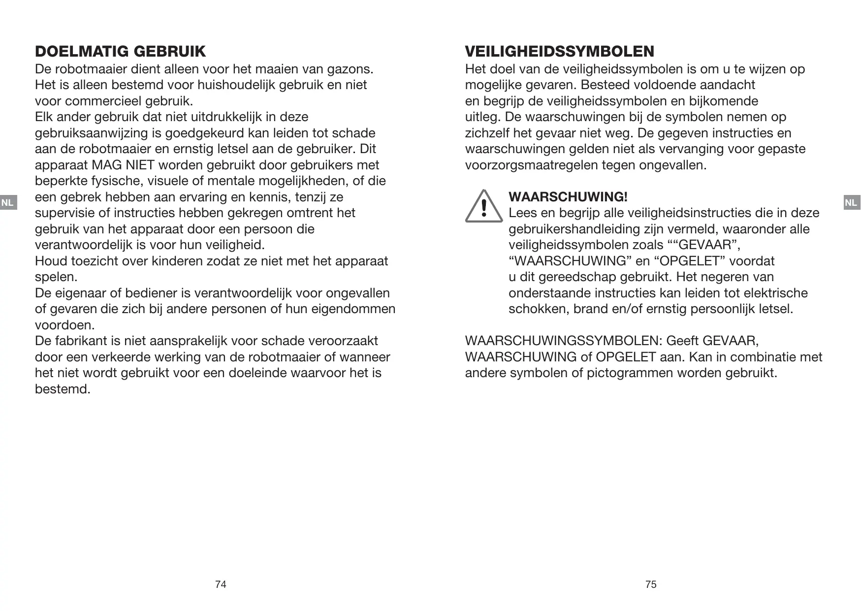 Le propriétaire ou l'utilisateur est responsable de tout accident ou blessure impliquant des tiers et leurs biens. Le fabricant décline toute responsabilité en cas de dommage entraîné par une utilisation incorrecte du robot- tondeuse ou si celui-ci n'est pas utilisé dans le but prévu.