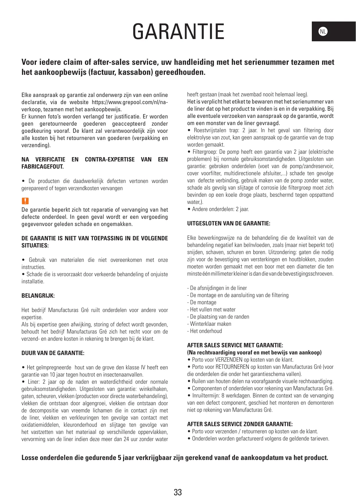 + Le liner : 2 ans sur les soudures et l'étanchéité, dans les conditions d'un usage normal. Ne sont pas garantis : Les accrocs, trous, déchirures, tâches (produits de traitement directement dans l'eau}, tâches liées au développement d'algues, tâches liées à la décomposition de corps étrangers en contact avec le liner, tâches et décolorations résultant de l'action de produits oxydants, tenue de couleur et l'usure due au frottement de la matière sur divers surfaces. Les déformations du liner resté plus de 24h