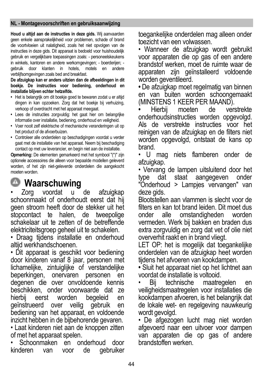 + La hotte ne doit JAMAIS être utilisée comme une surface d'appui, sauf indication expresse.